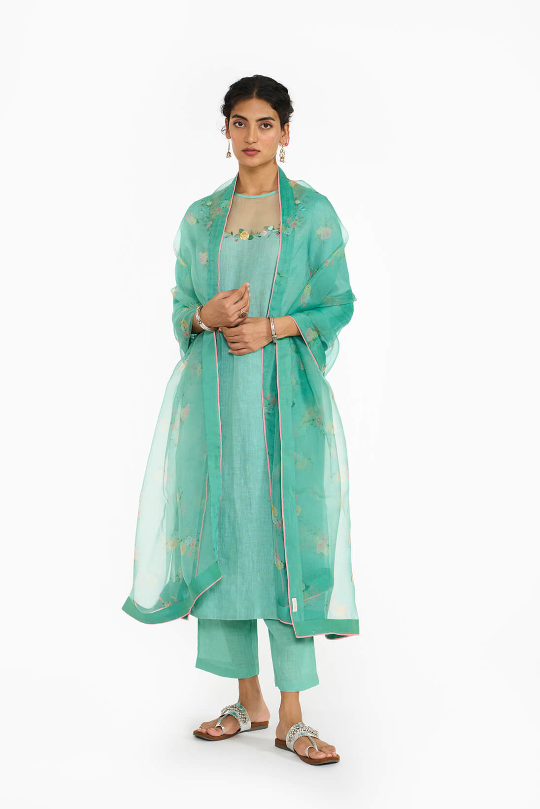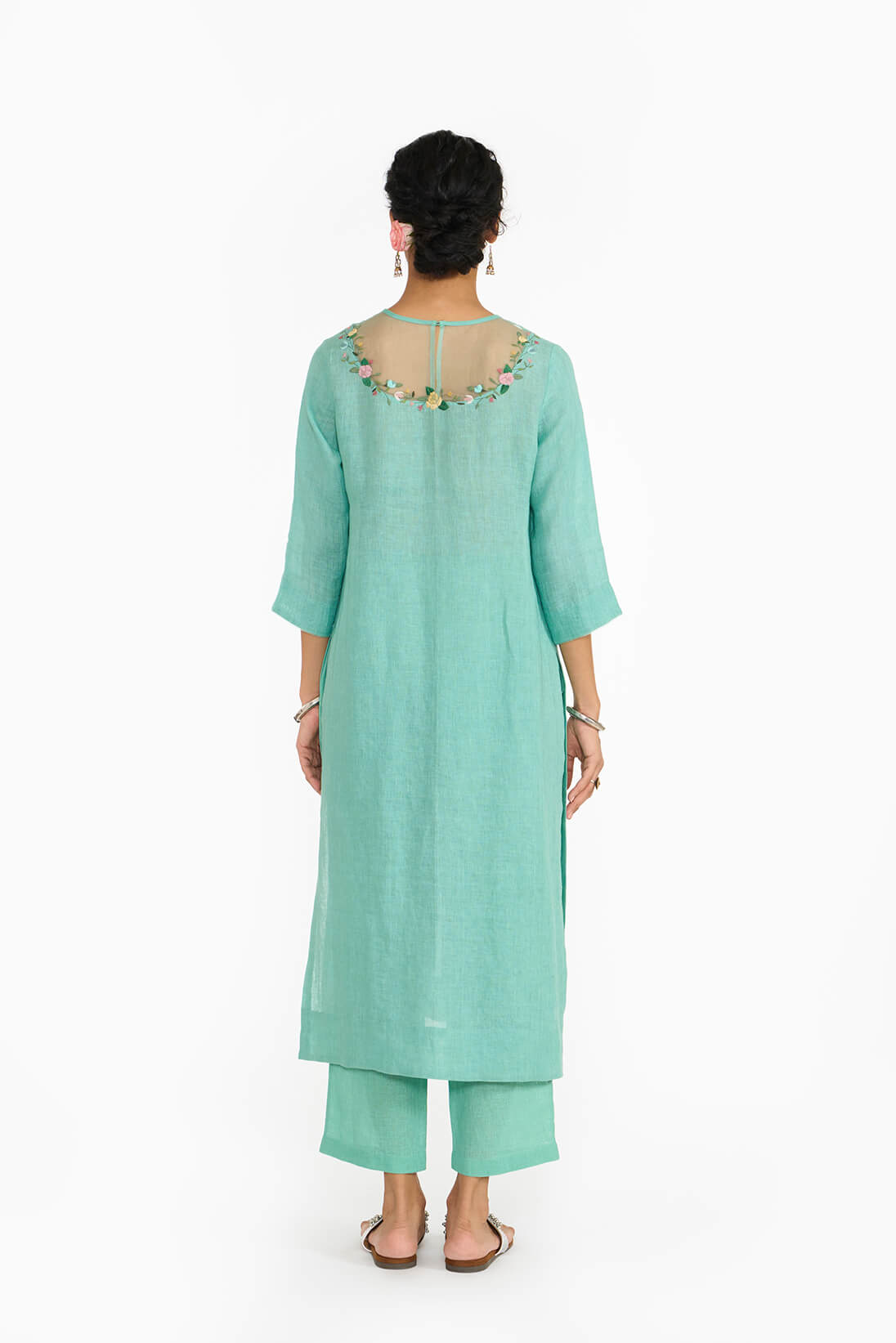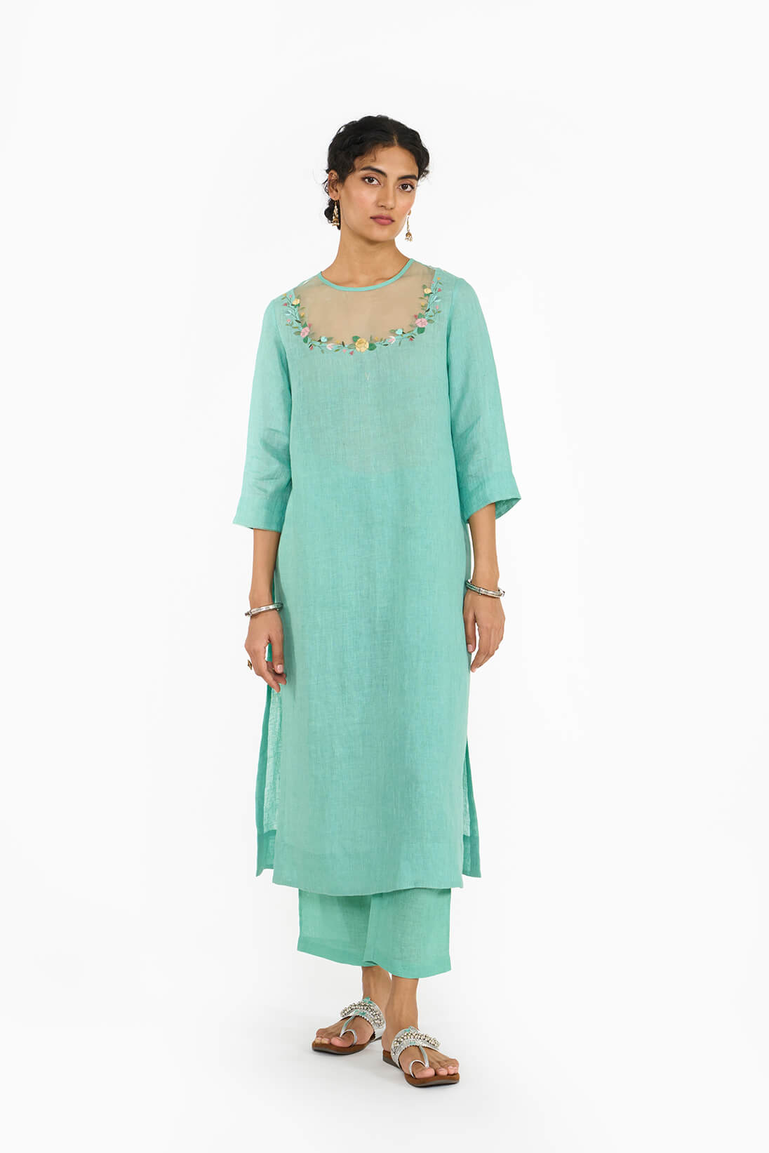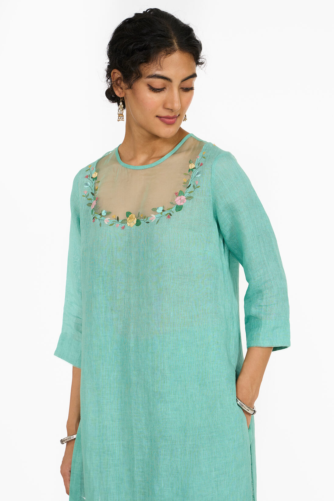 Colette kurta showcases a mock French Bavoir look. Organza forming a crew neck & a linen scoop neckline meeting at an embroidered seam featuring multi-colored roses and motifs from indo-french art.