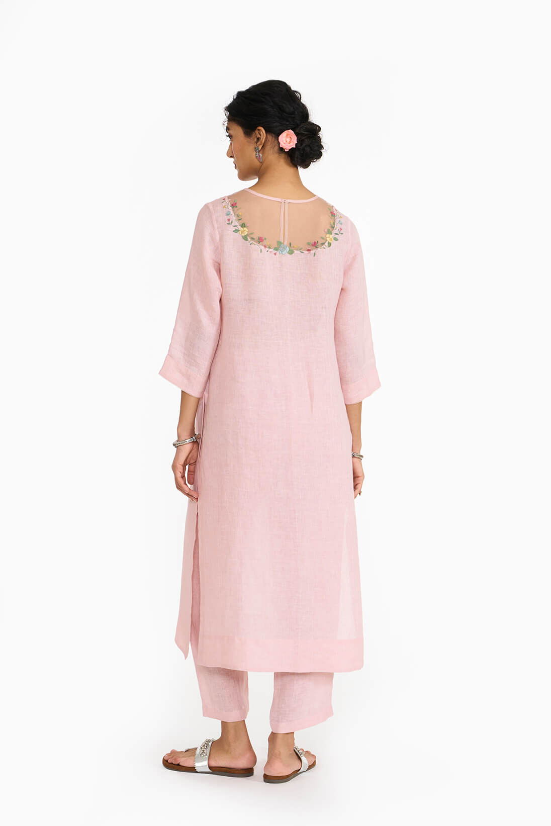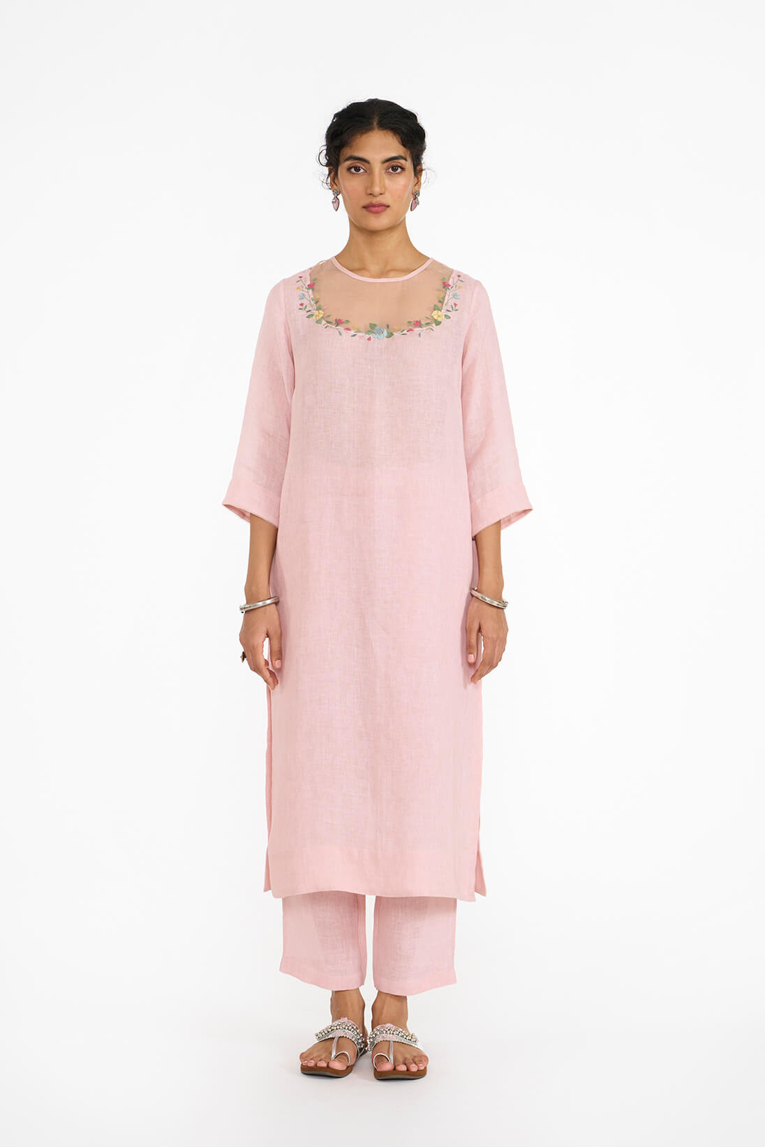 Colette kurta showcases a mock French Bavoir look. Organza forming a crew neck & a linen scoop neckline meeting at an embroidered seam featuring multi-colored roses and motifs from indo-french art.