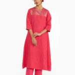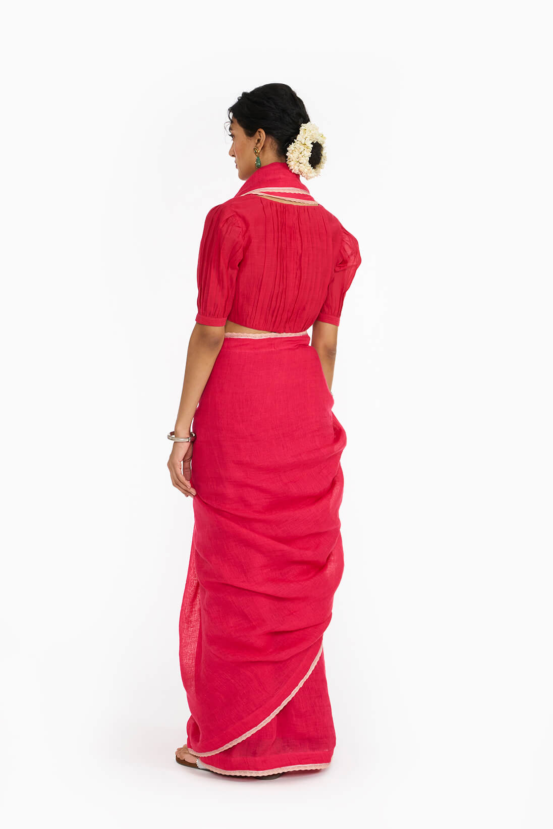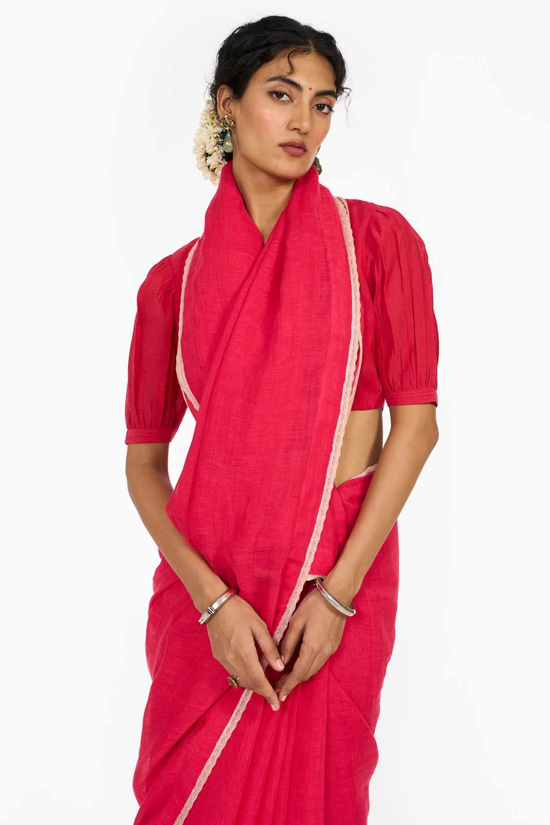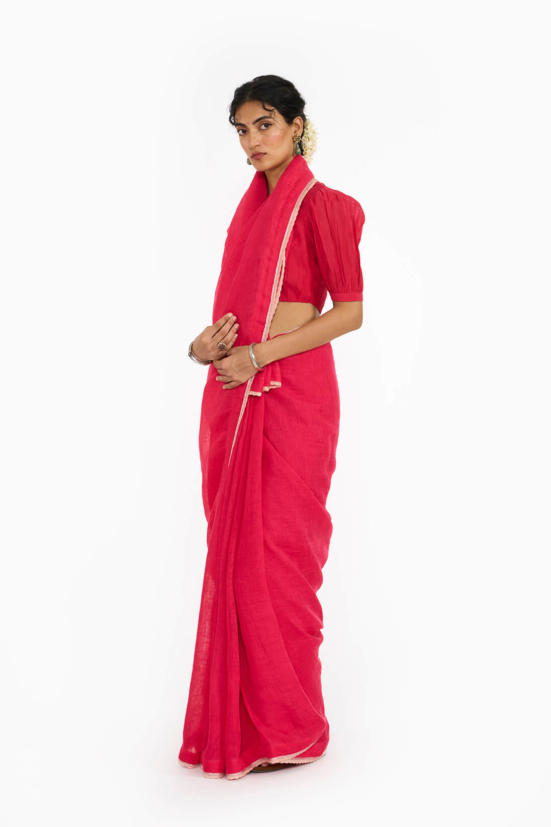 Our classic handwoven linen sari in a bright hue is complemented by contrasting lace details, enhancing its playful and youthful charm.