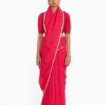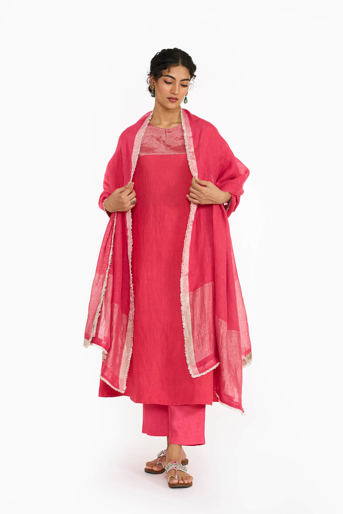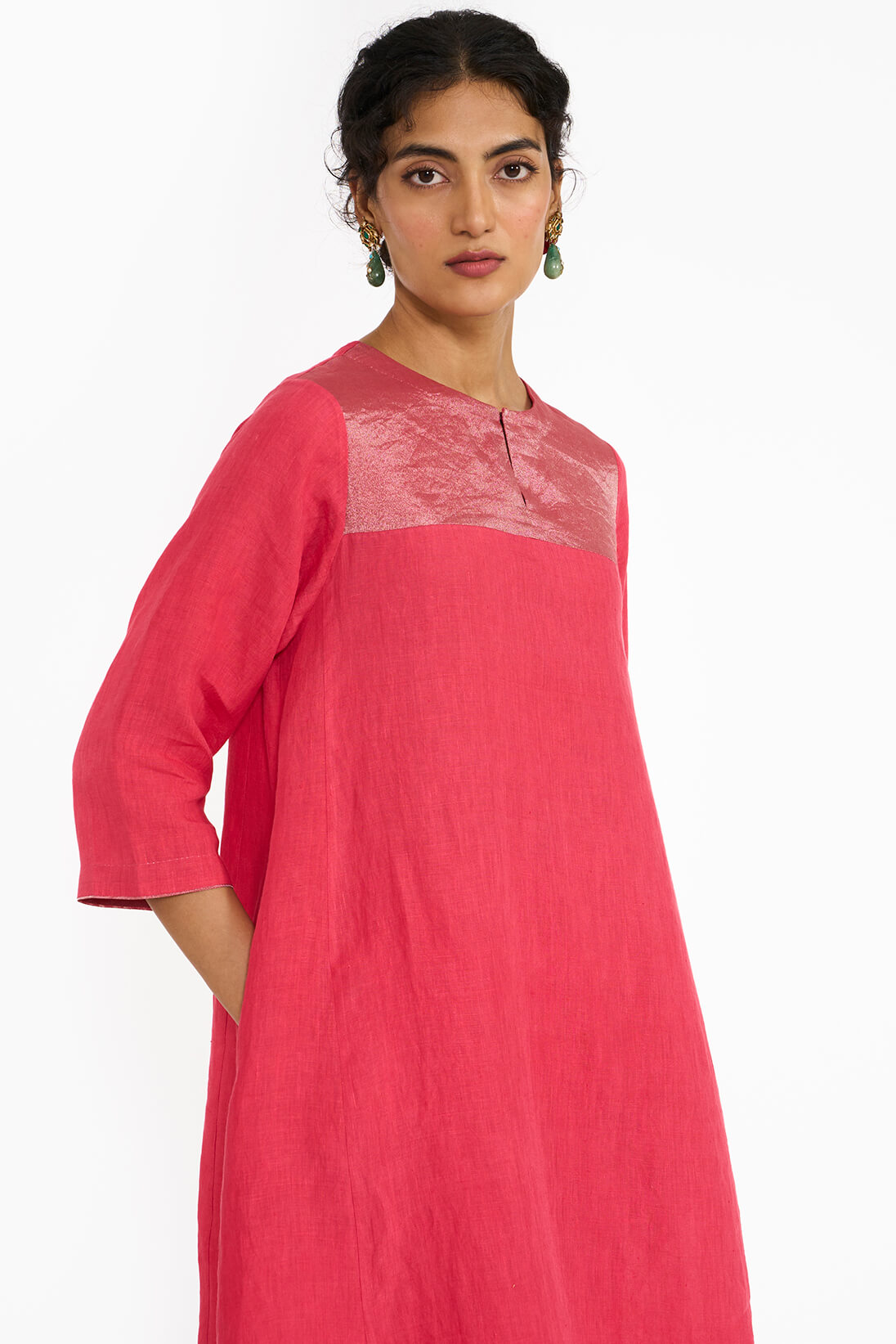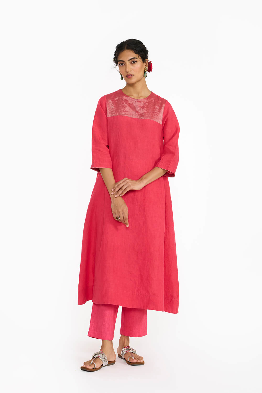 This bright pink handwoven linen kurta highlights a stunning zari yoke in an effortless A-line paneled cut.