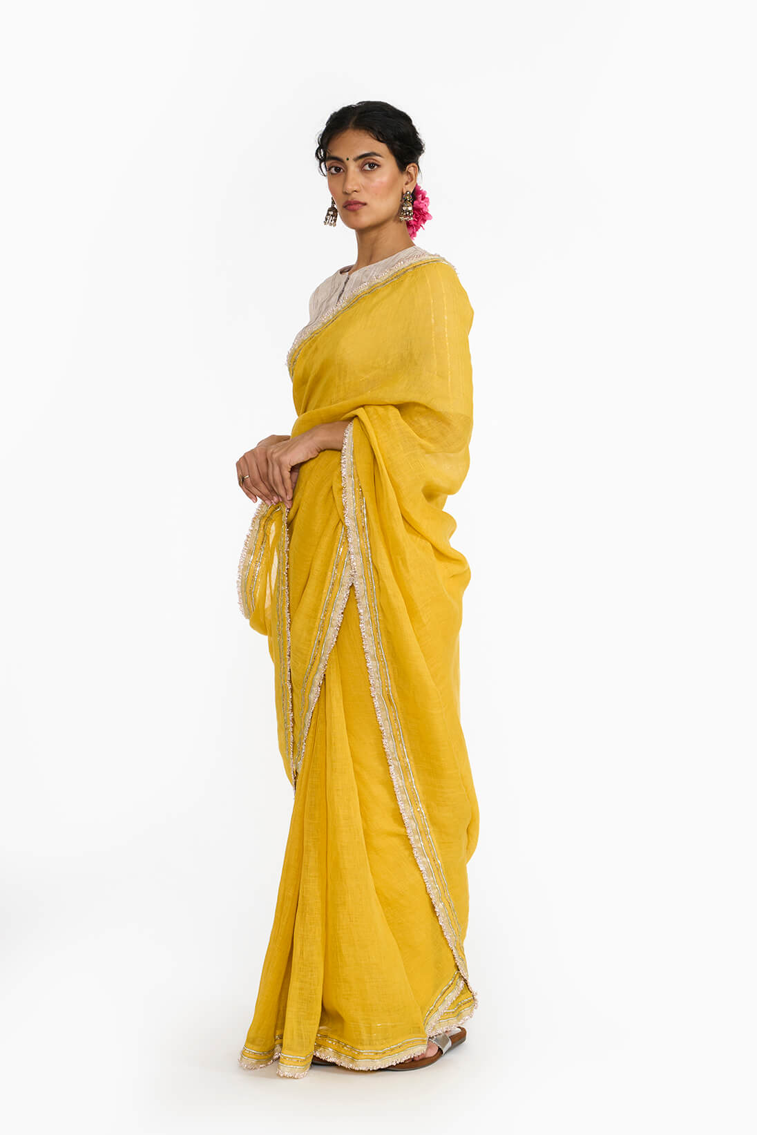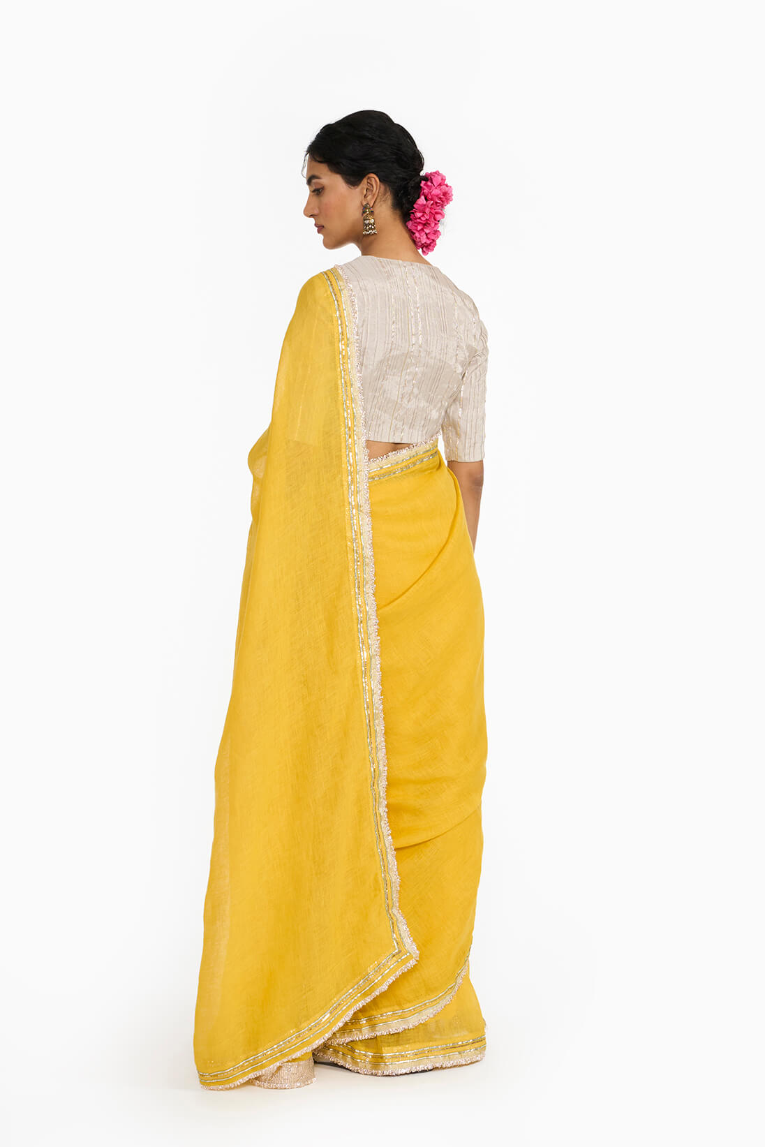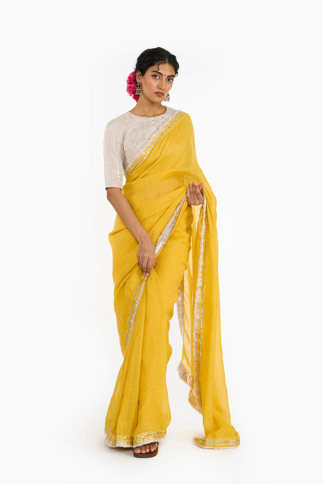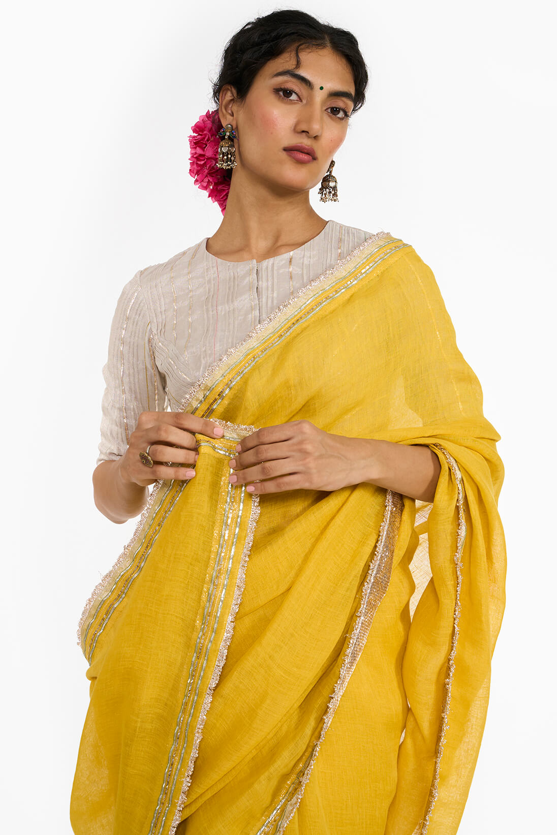 Topaz handwoven linen sari is detailed with hand-embroidered fine gota and sequins, finished with kinari and a gota facing making it a classic festive choice.