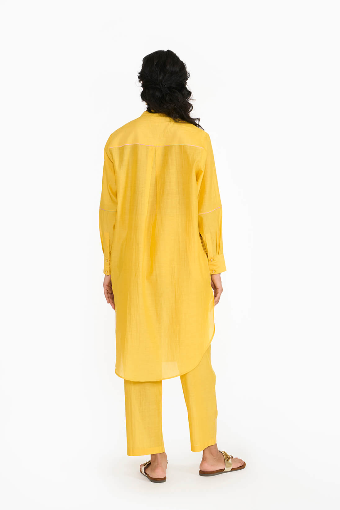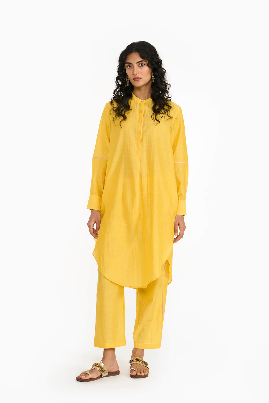 Our classic kameez set gets a festive makeover with a bright yellow base and complementing contrast details.
