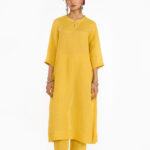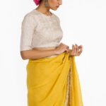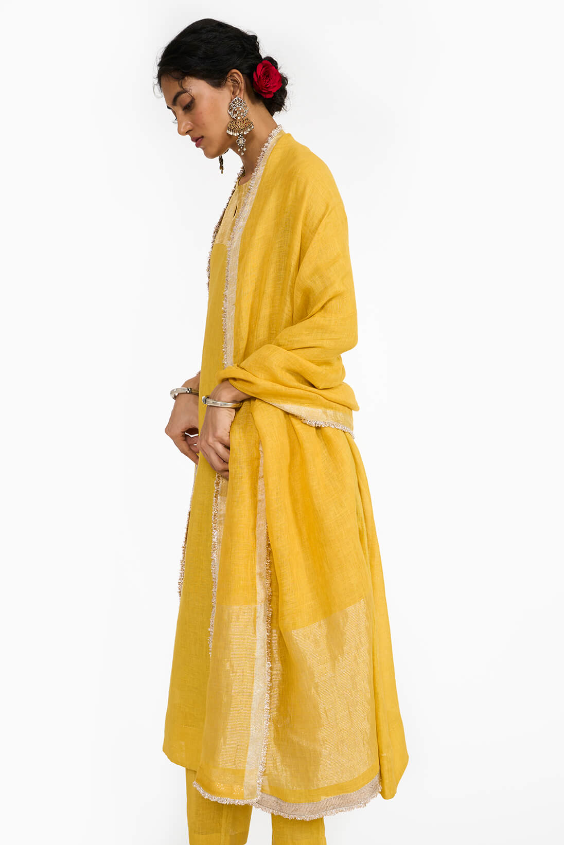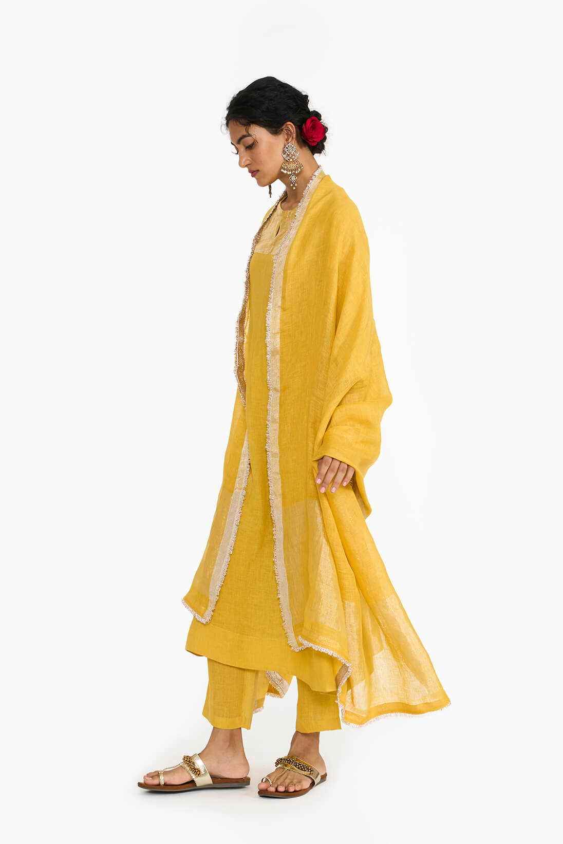 Our classic handwoven linen dupatta in bright topaz color is finished with gota & kinari making it perfect for festivities.