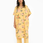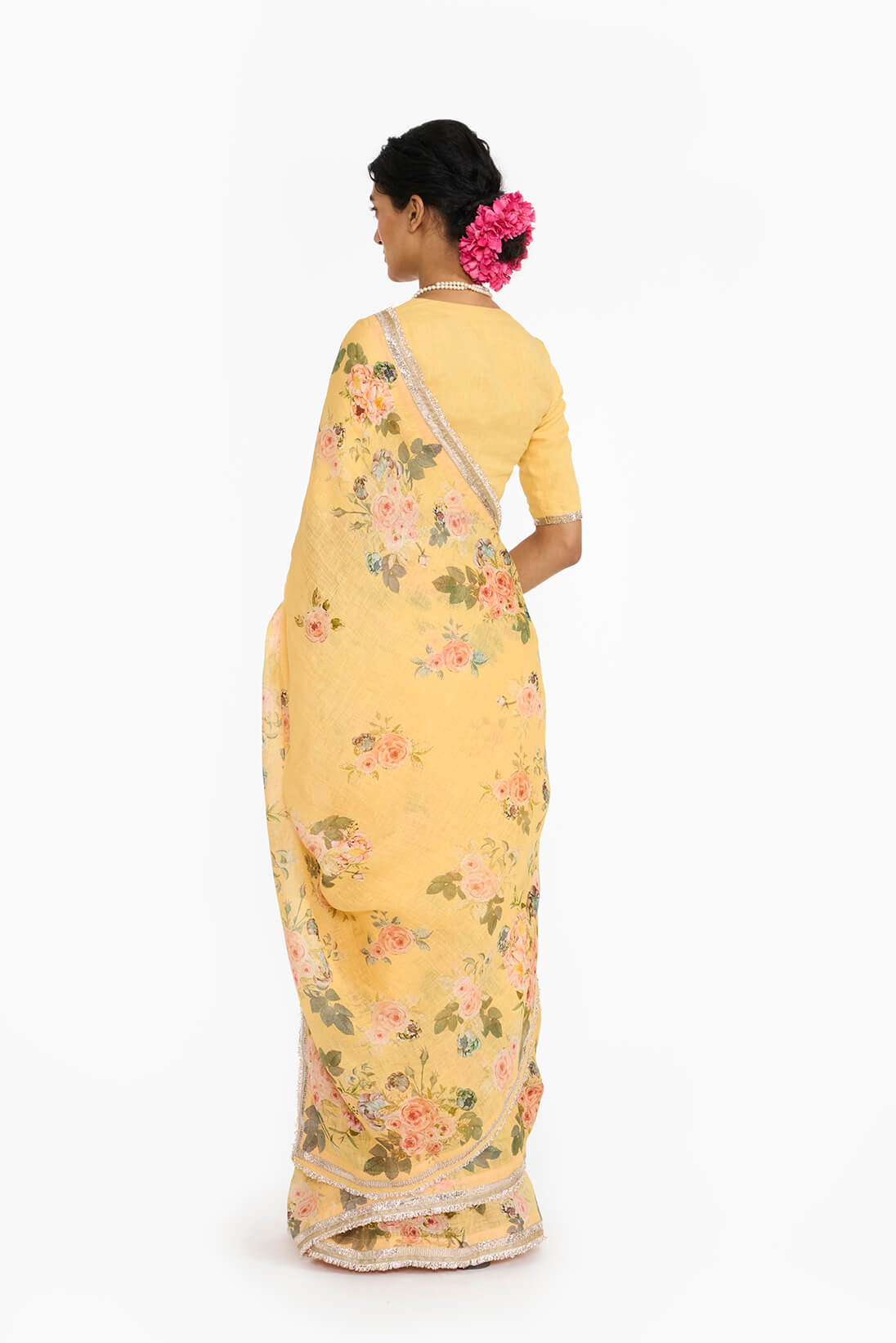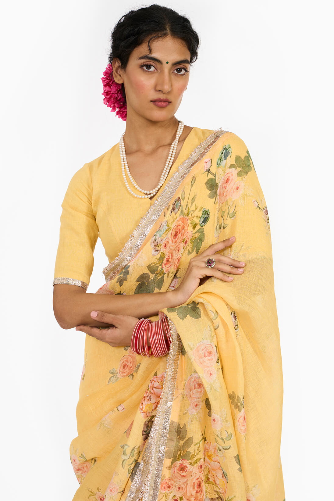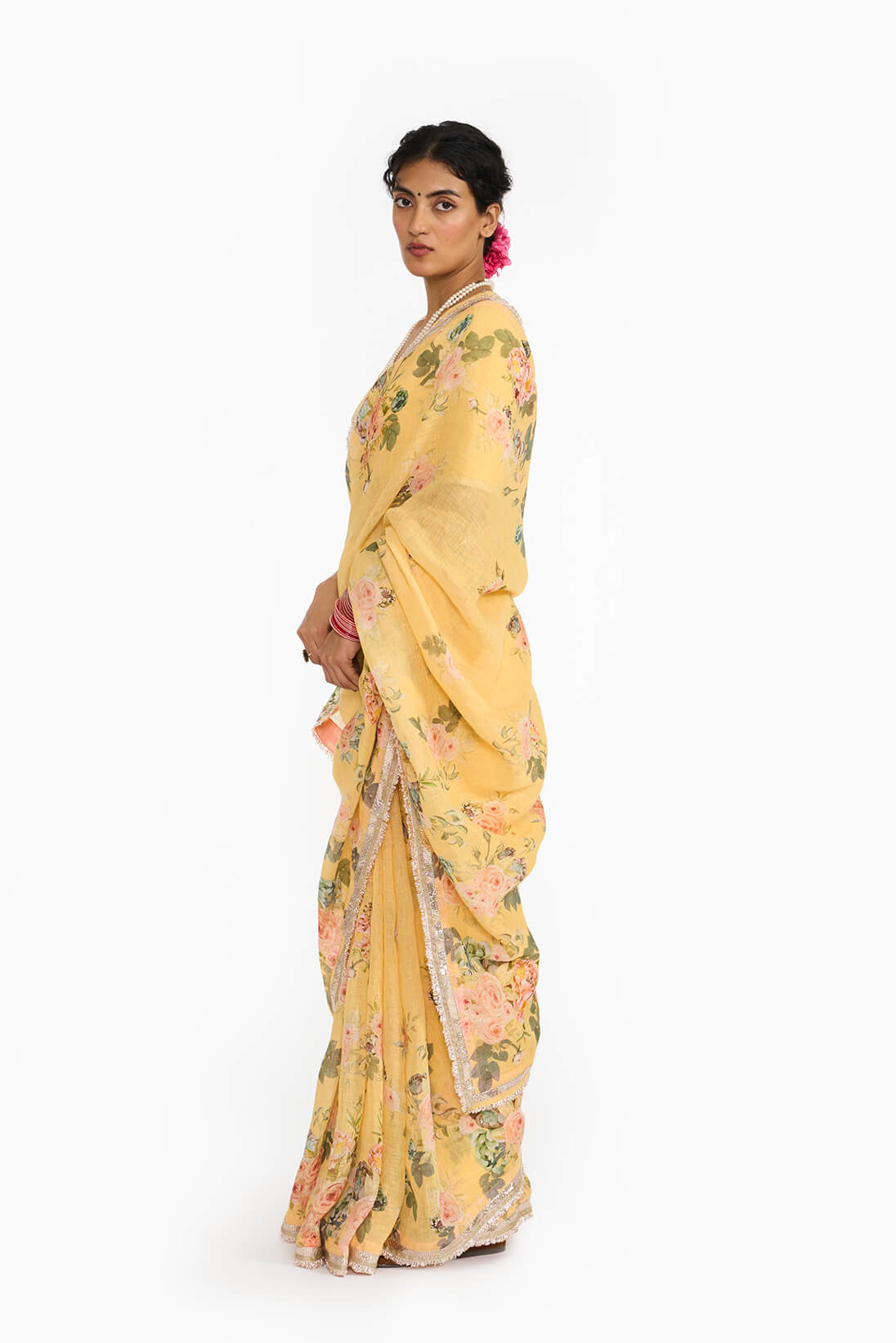 This handwoven linen sari showcases a delicate floral cluster print enhanced with gota kinari detailing to evoke a festive aura.