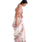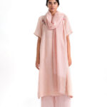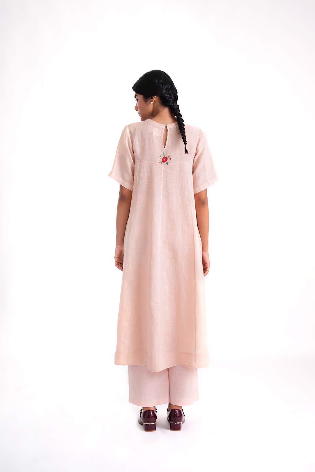 The Edith Set is a soft peach linen kurta with A-line paneled cut. A standout embroidery motif adorns the yoke, crafted with intricate fabric appliqué and fine aari embroidery.