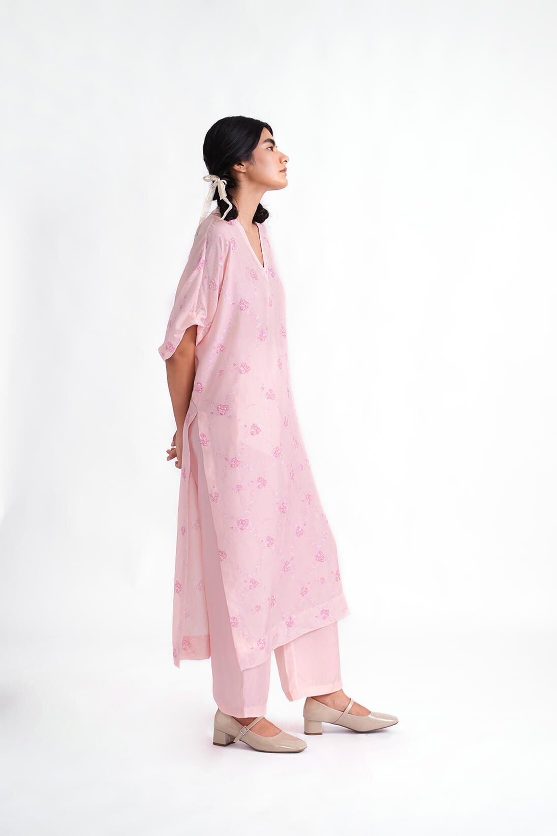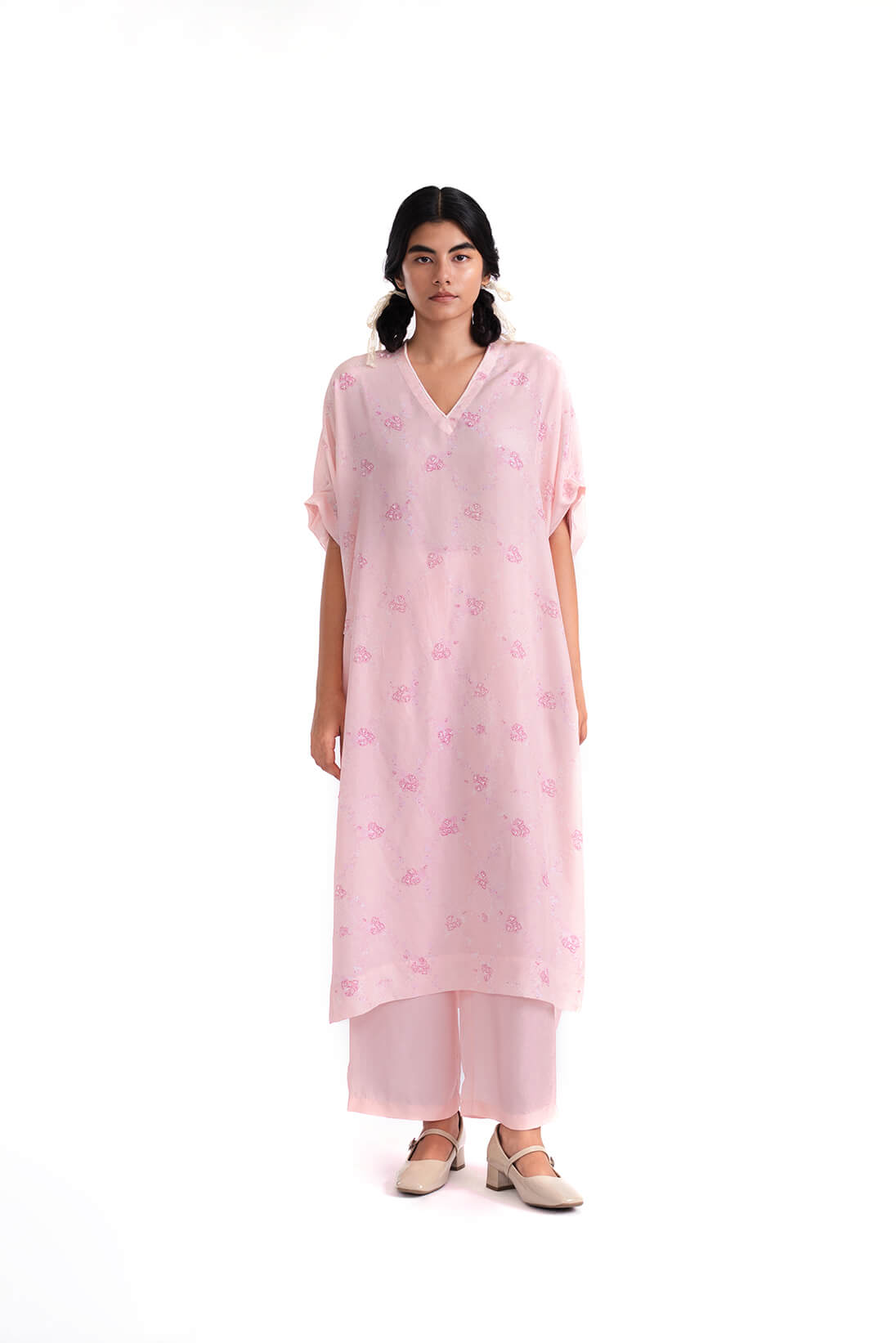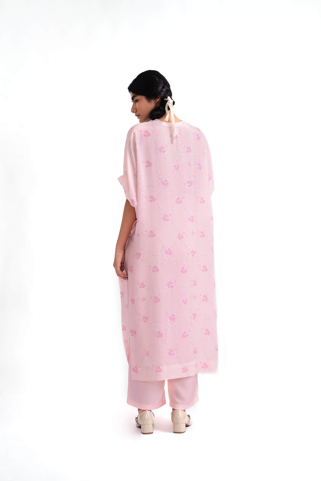 The Juliette Kaftan features an easy-cut silhouette in mulberry silk adorned with a baroque wall painting-inspired print in elegant monochrome tones. Hand-embroidered embellishments highlight the set, adding a festive touch