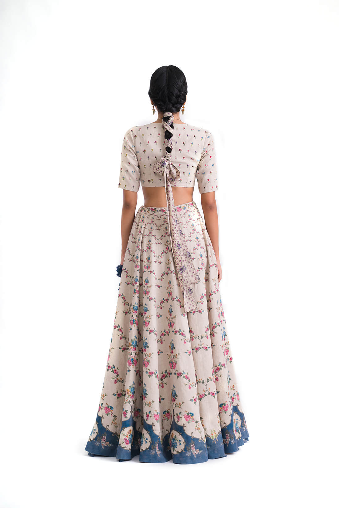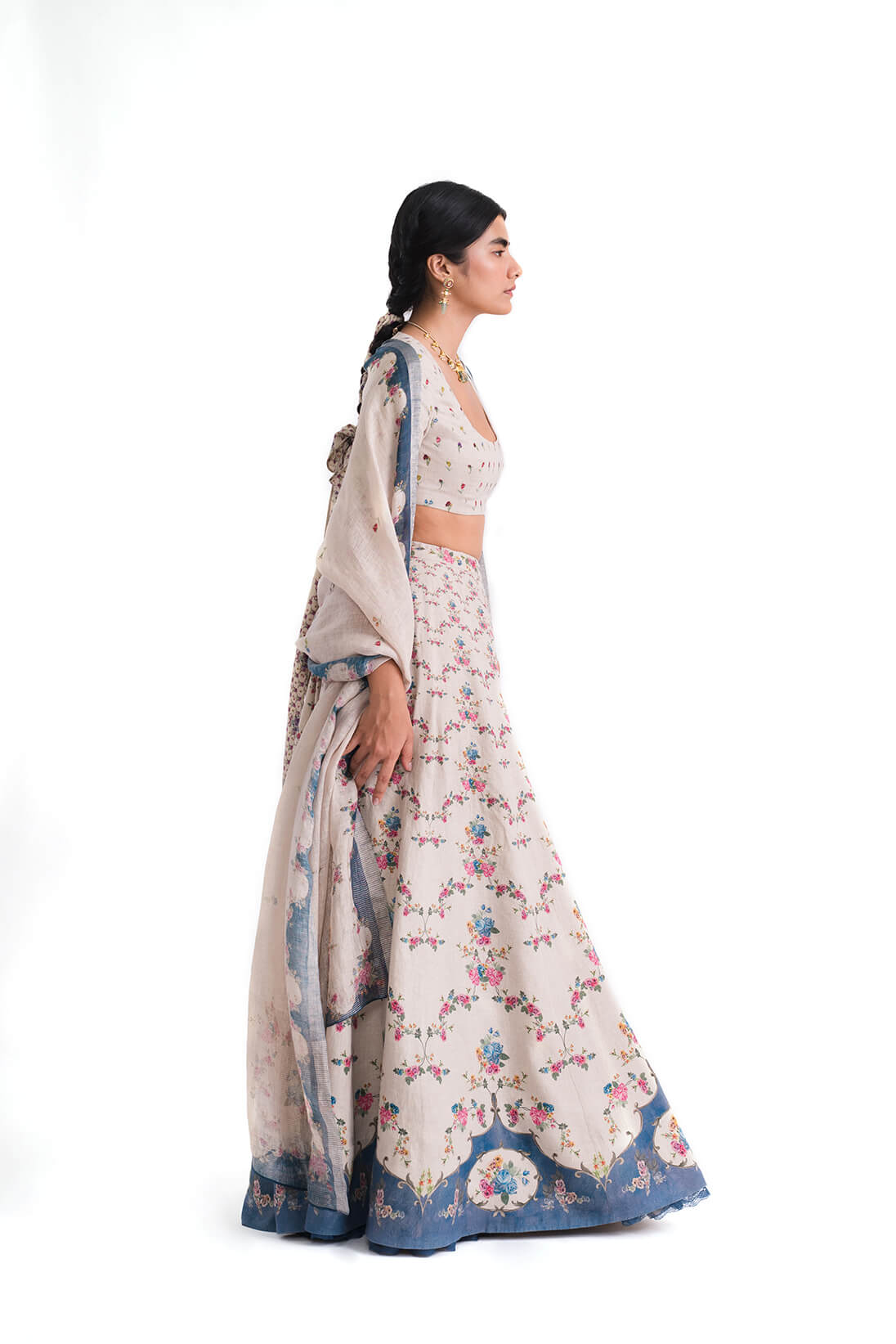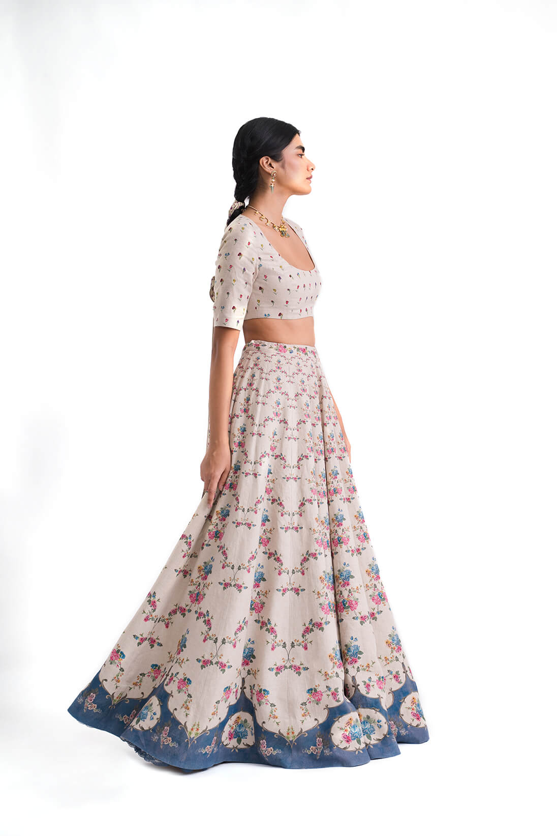 The Meira Lehenga is our interpretation of the traditional lehenga silhouette, crafted in our signature natural linen. It features a baroque ceiling inspired print that cascades from the waist to the hem in vibrant shades of pink and blue finishing into a deep indigo color block.