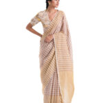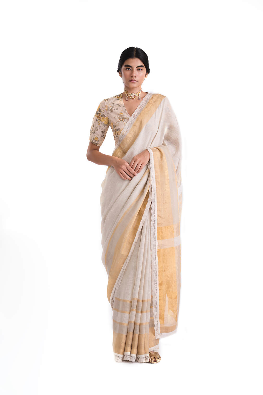 Sehar Natural Sari is festive handwoven linen sari featuring a striped pattern in ivory and gold on a natural linen base. The sari is finished with delicate lace and handwoven zari.
