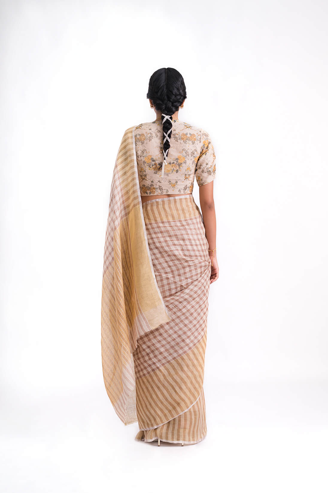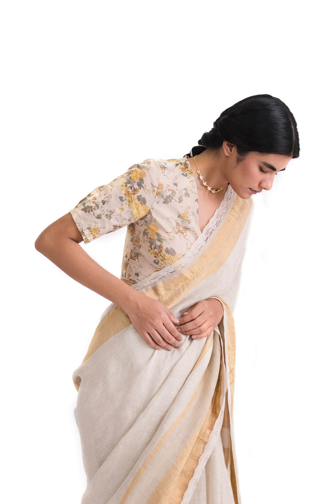 The Seher Gold Blouse showcases a baroque-inspired floral scallop pattern, rendered on a classic fittied bodice silhouette in a soft yellow and beige tones on handwoven zari textile.
