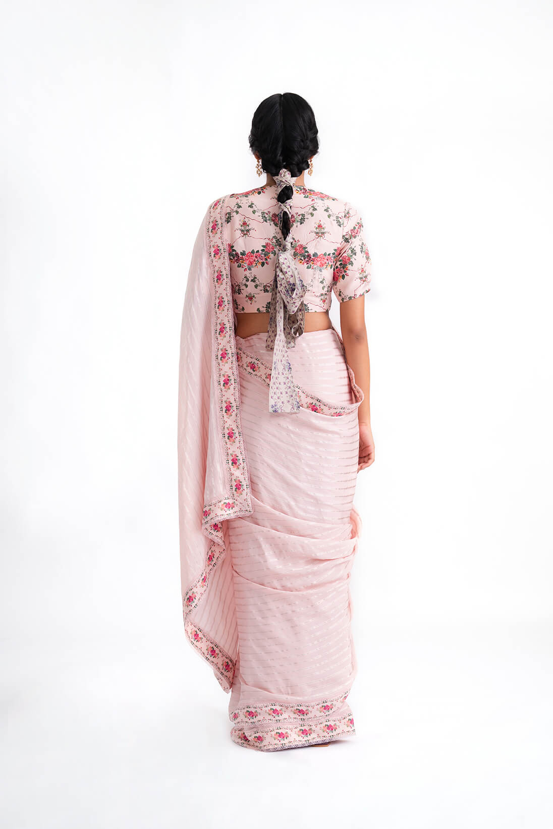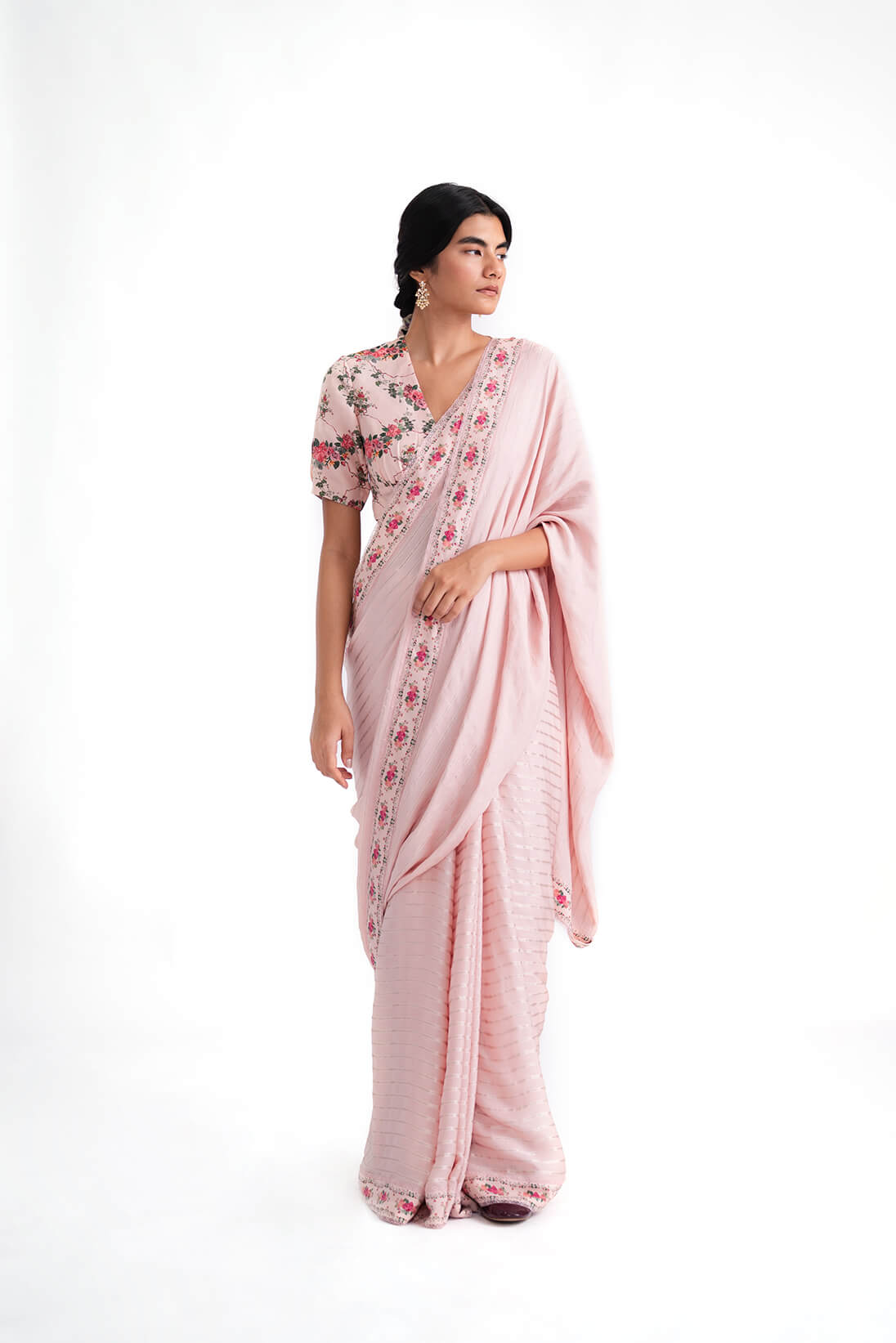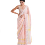 The Yusra sari features a textured striped pattern on a fine handwoven silk base and a floral silk border joined with delicate french laces.