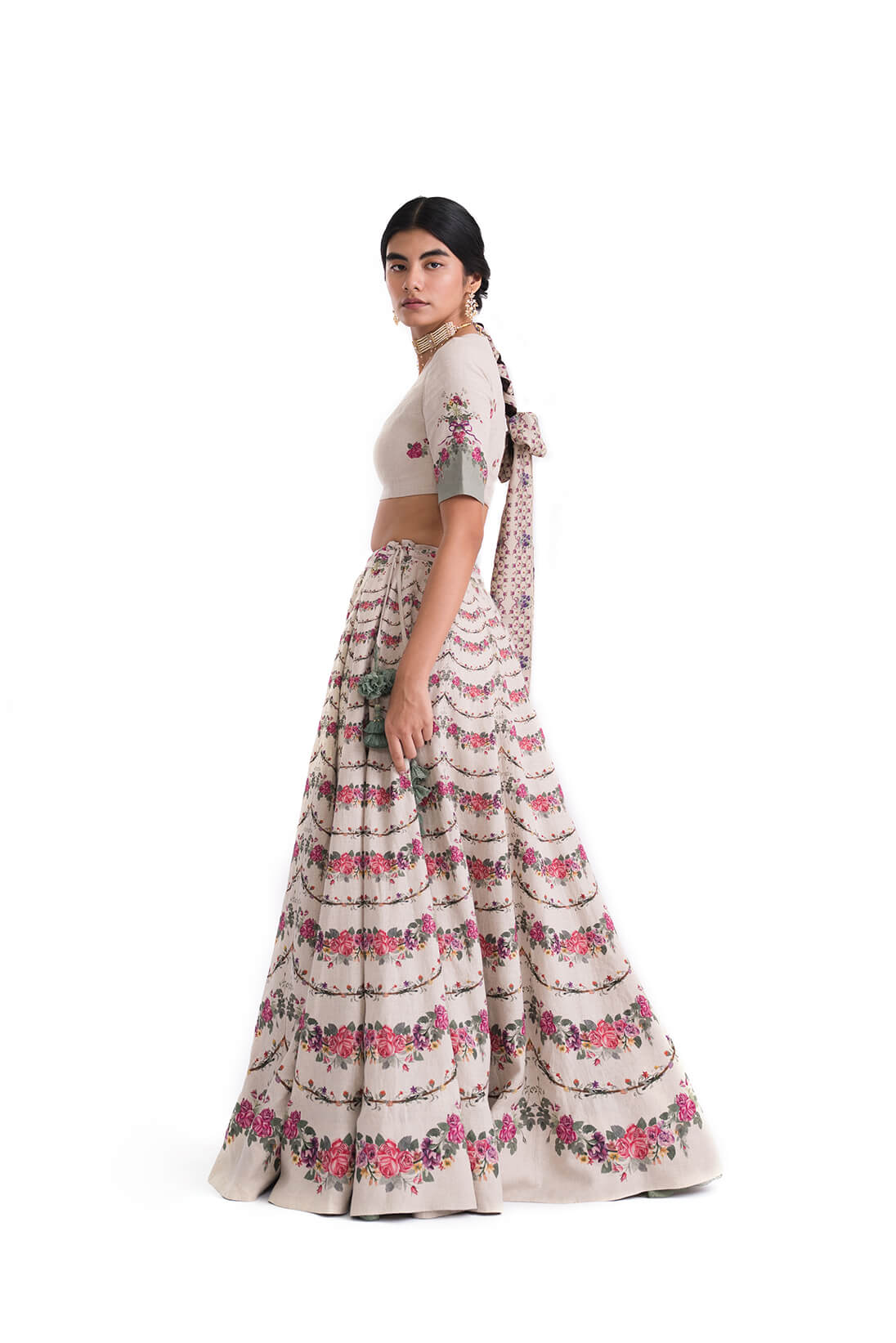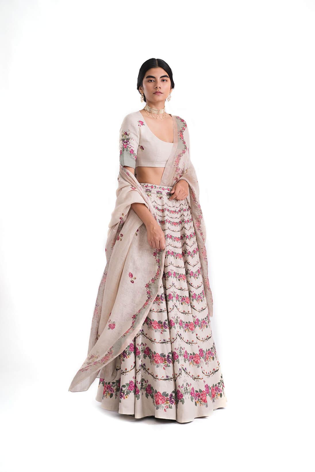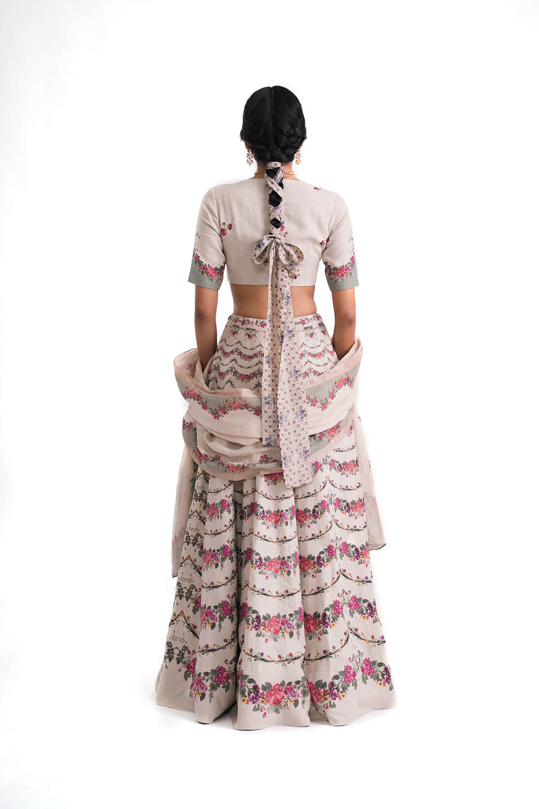 The Ziba Lehenga is our interpretation of the traditional lehenga silhouette, crafted in our signature natural linen. It features a baroque-inspired floral scallop print that cascades from the waist to the hem in vibrant shades of pink and green.