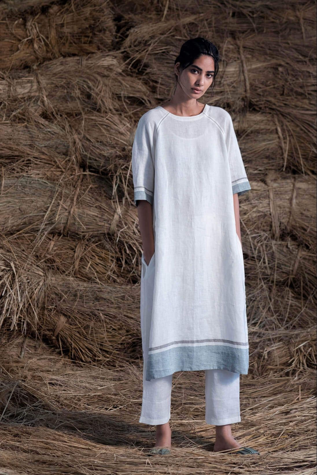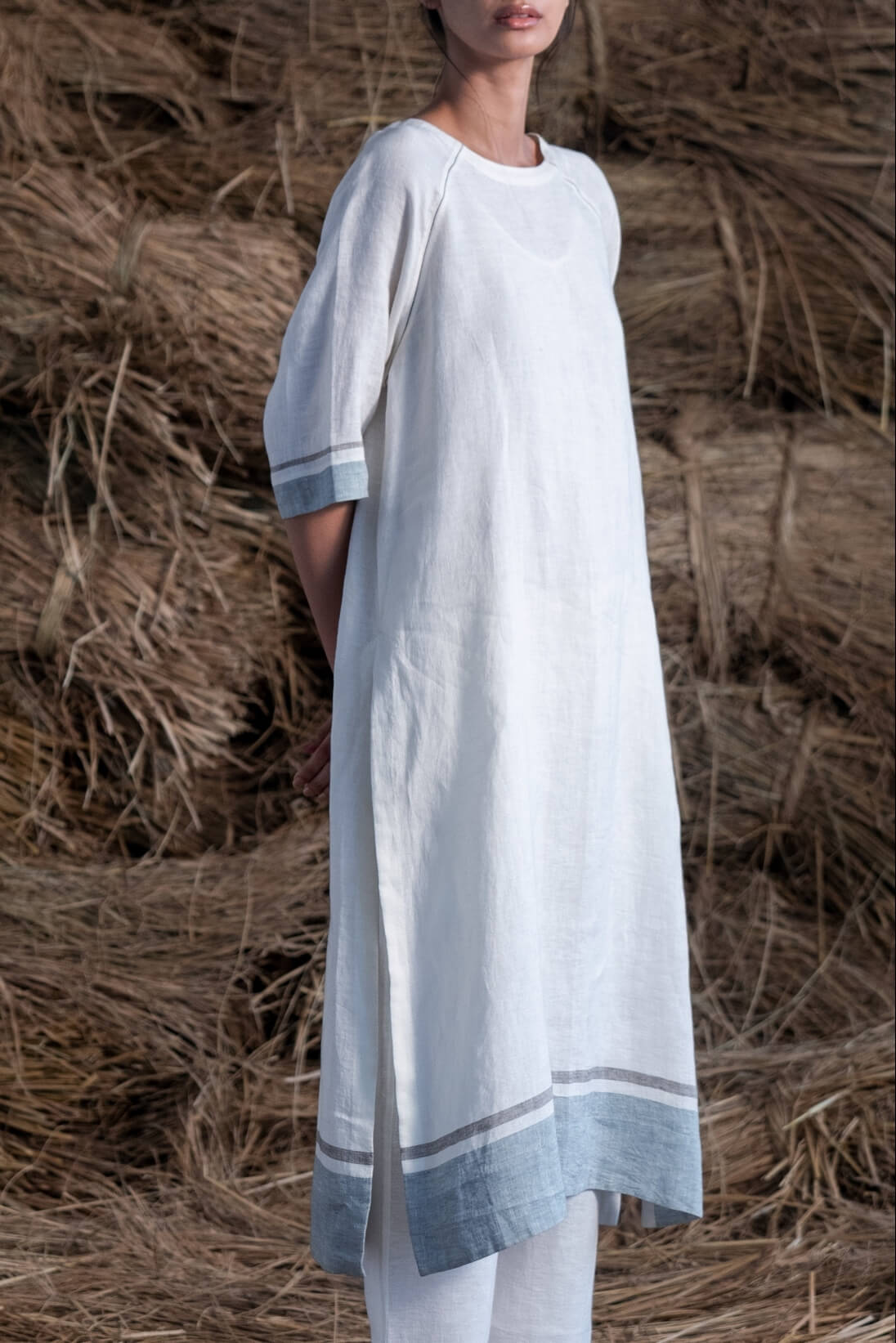 Detailed with colored stripes our khadi linen Nova set can be worn with or without a stole.
