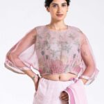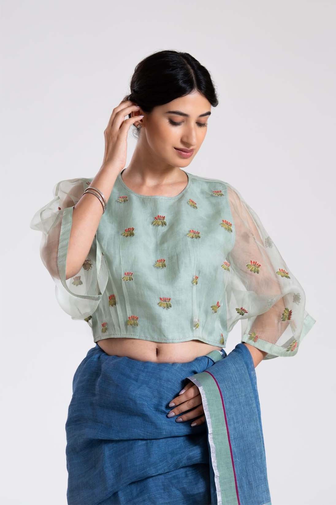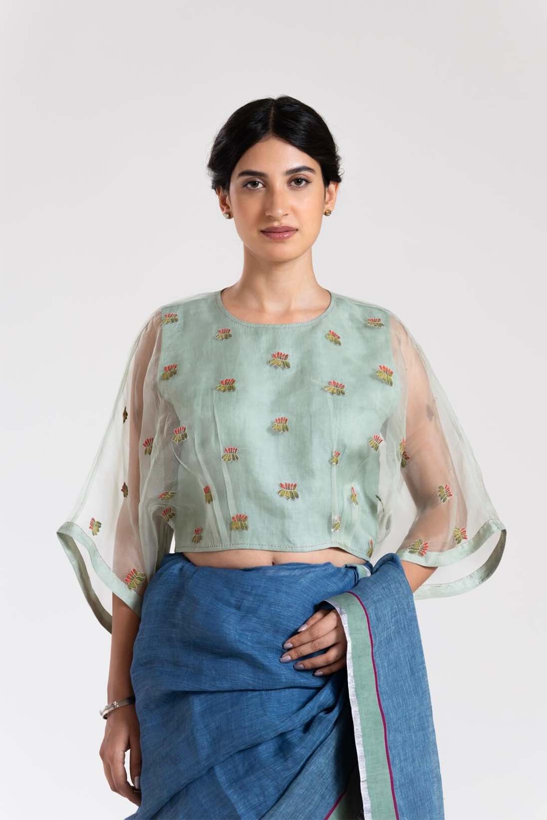 Our classic kaftan blouse with soft pastel applique flowers can be paired with most of the pastels saris in your wardrobe.