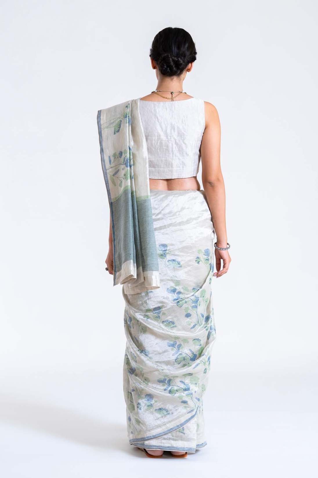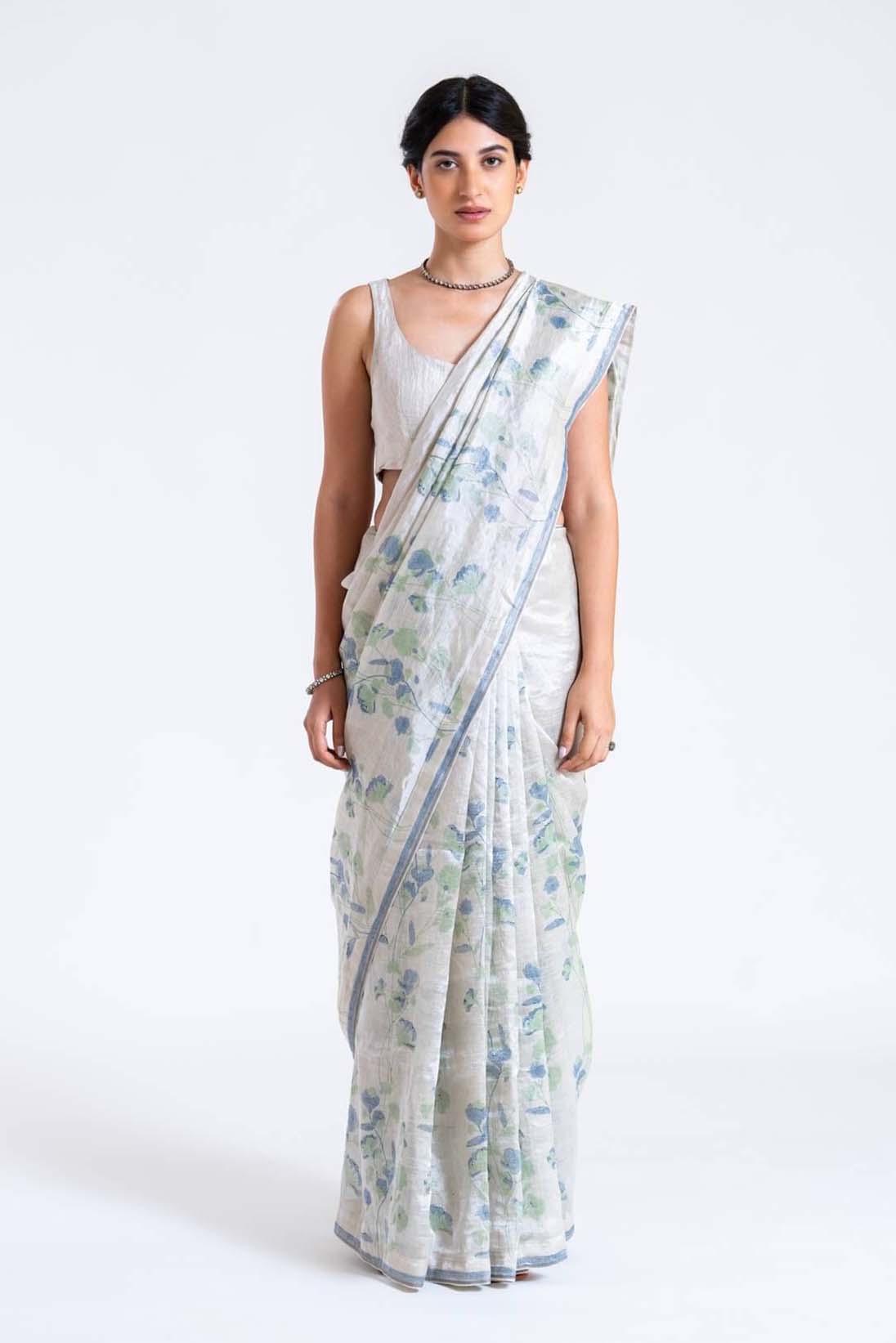 - Indigo Boriya Handblock Printed Zari Sari