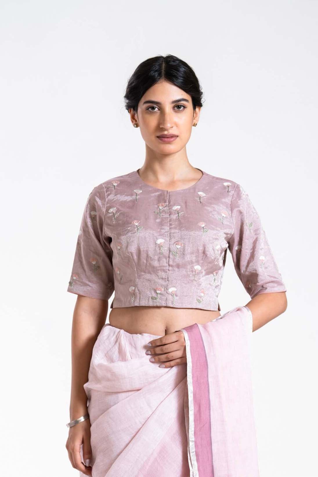 Delicate kachnar flowers come alive on this zari blouse though the beautiful applique technique.