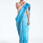 This sari comes with one meter woven blouse fabric. The blouse shown on the model is just for representation.