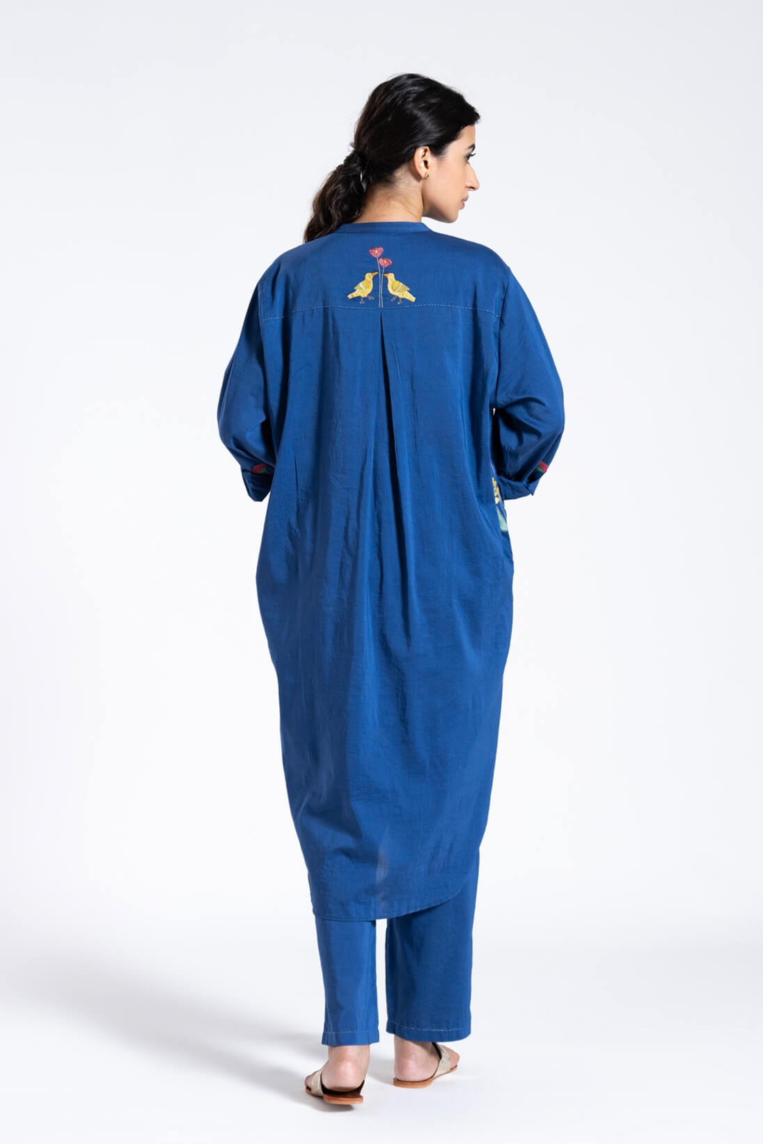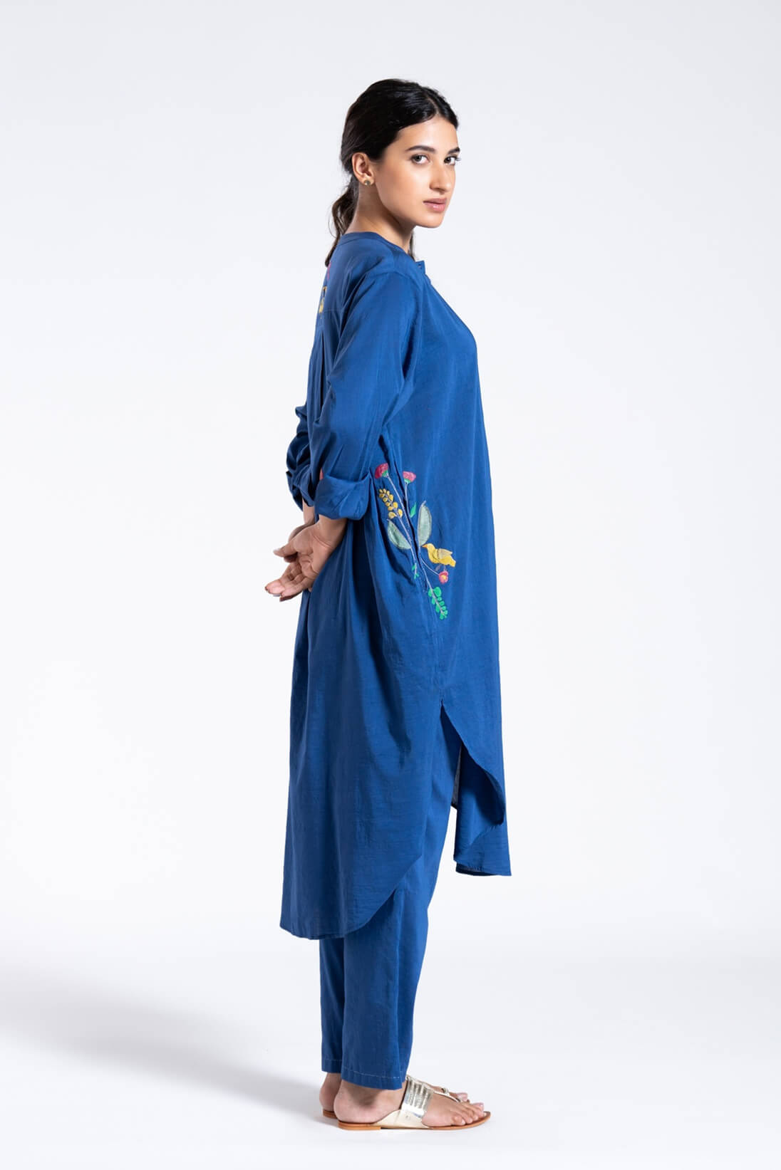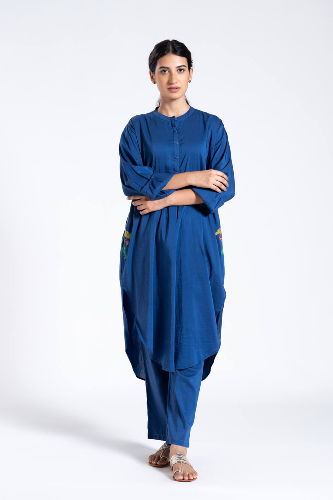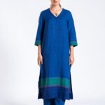 The very comfortable Kameez Set gets a festive makeover with special applique embroidery on pockets, yoke and a little flower on sleeve.