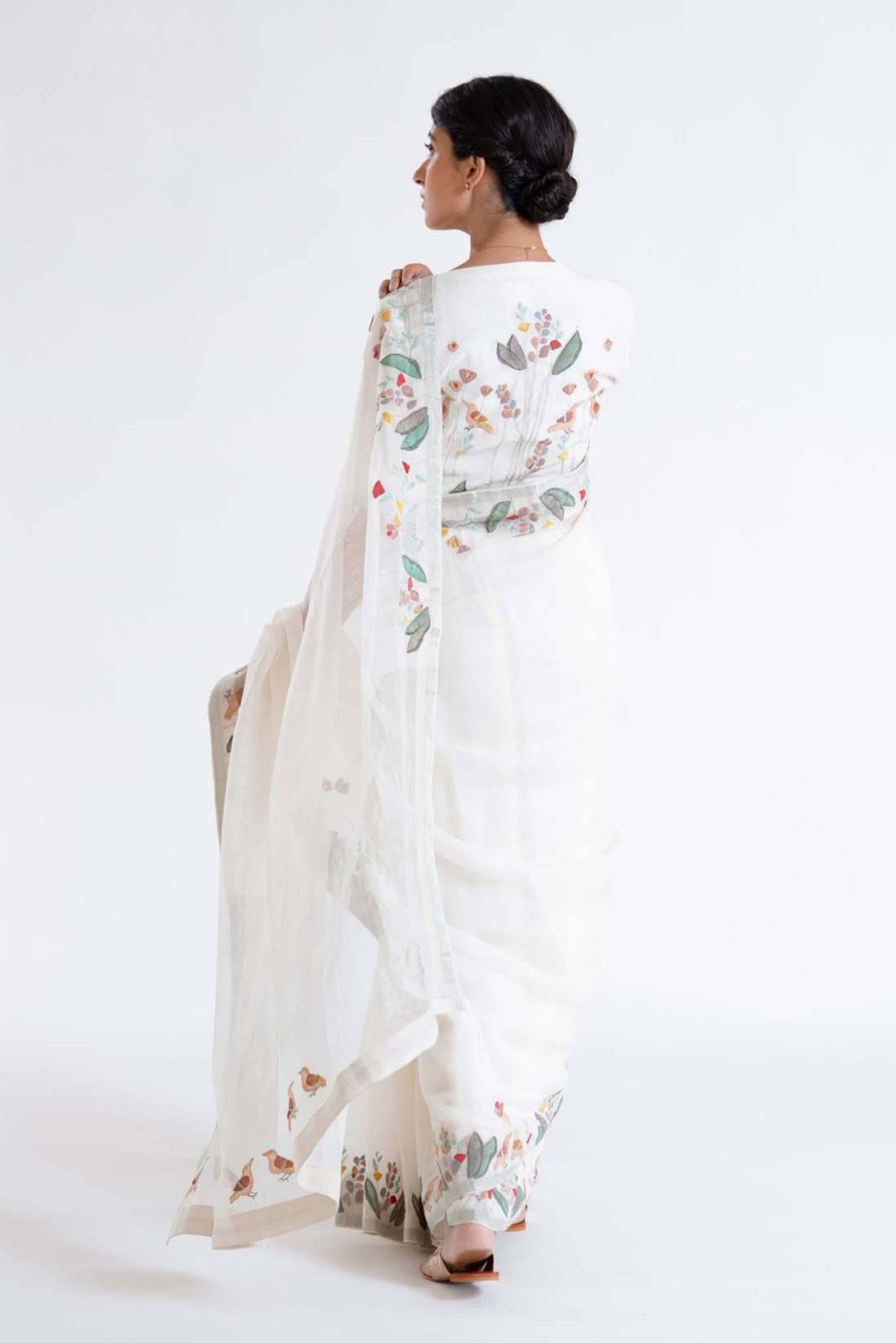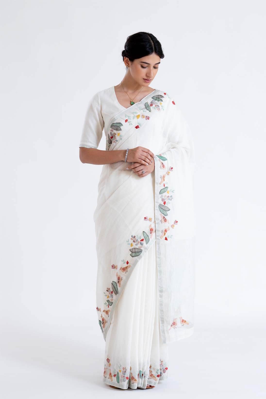 The ivory hand woven silk khadi sari is decorated with beautiful hand applique of trees and birds which takes you to memories of bygone eras of lush forests full of flora and fauna.