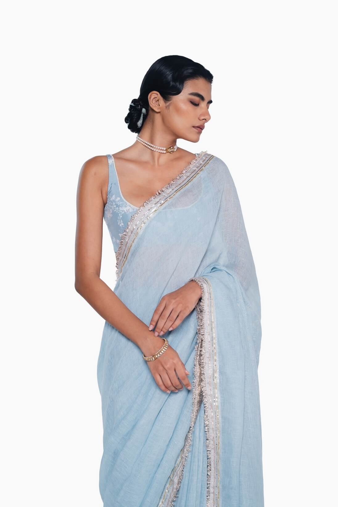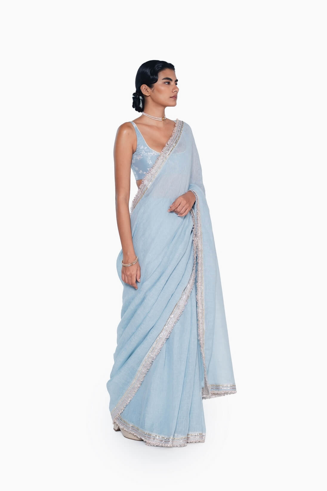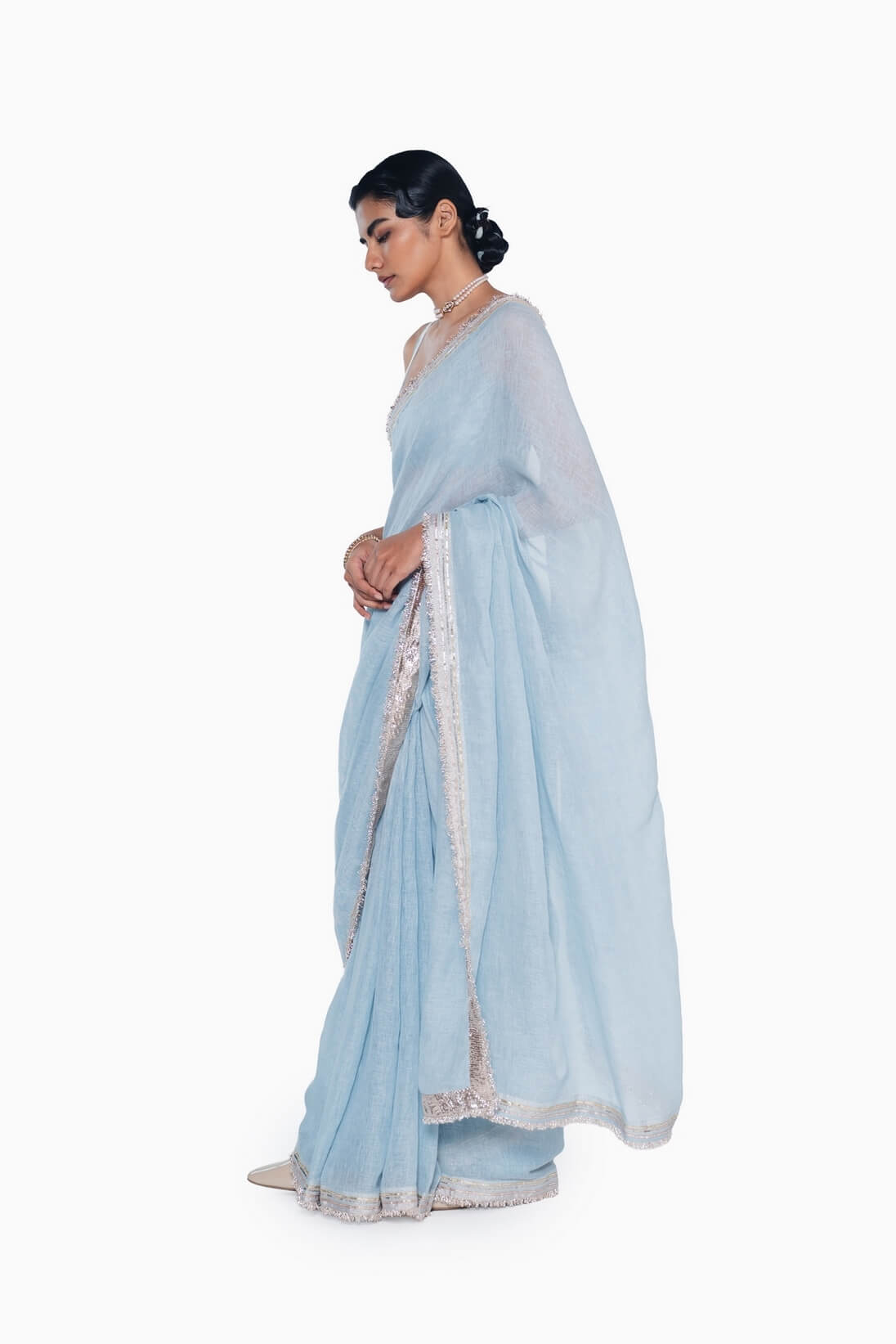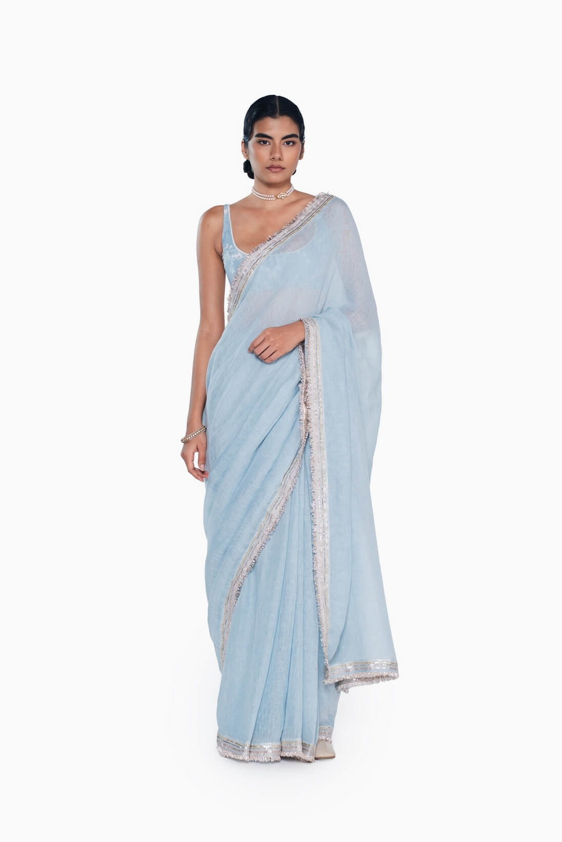 Our Classic handwoven linen sari comes alive with delicate gota and sequin hand embroidery, its edges finished with kinari and gota facing. Light, festive, and timeless, it’s the kind of piece that feels both celebratory and effortless to wear.