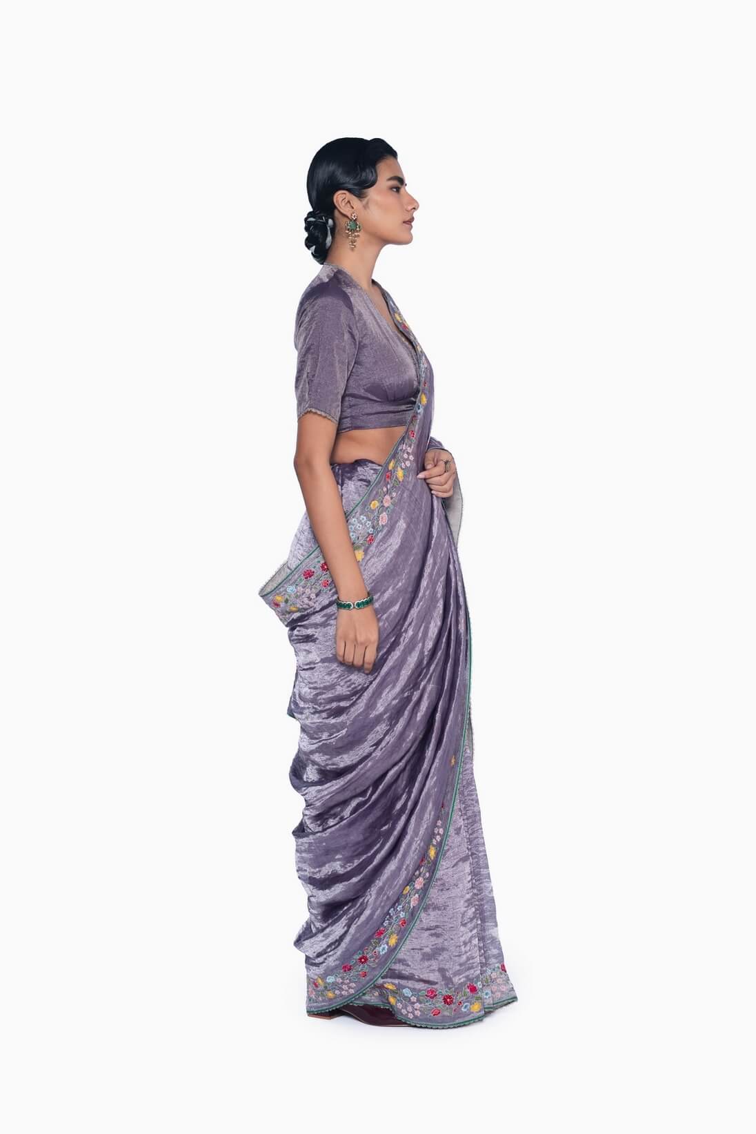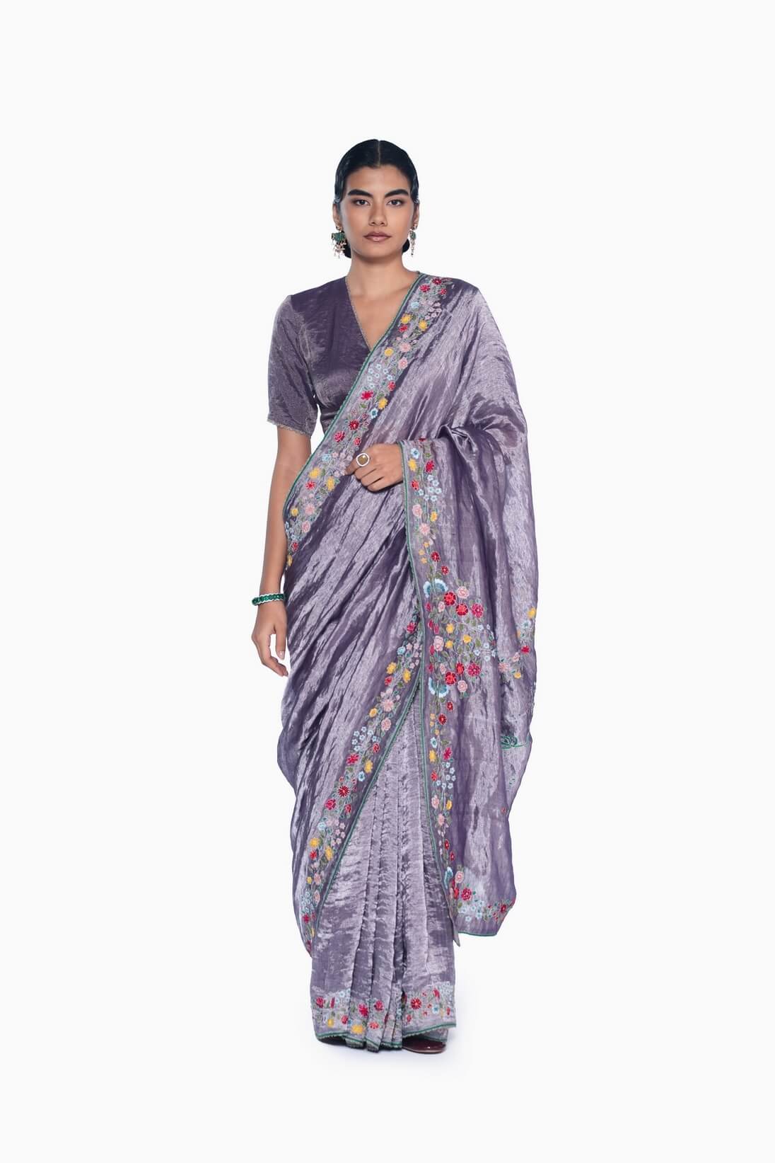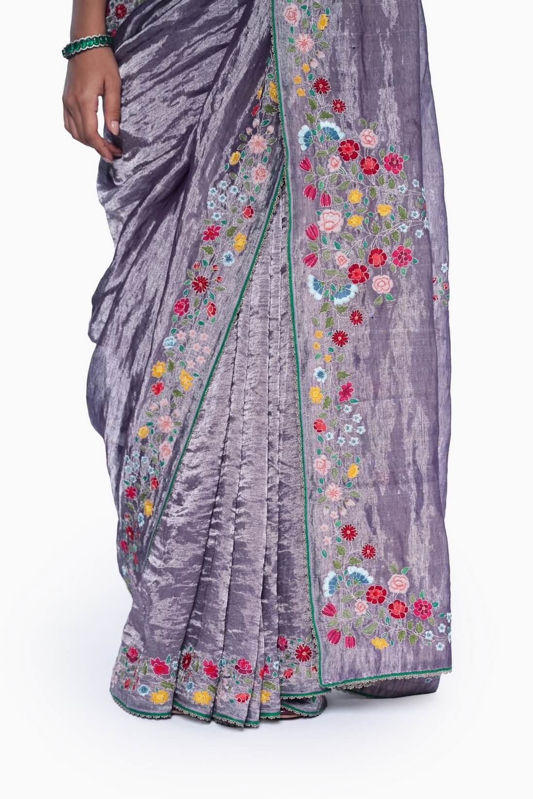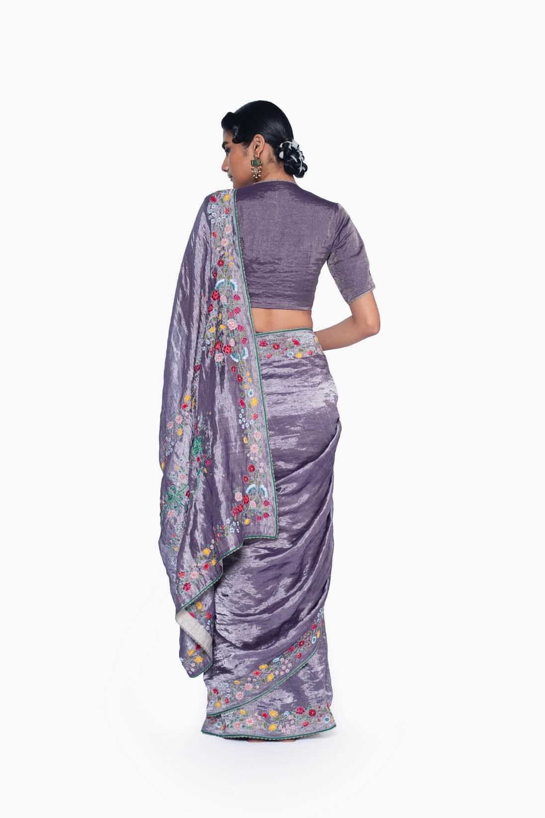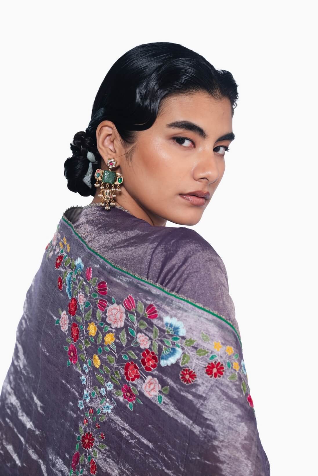 Durru carries a vintage soul, its motifs inspired by antique French tapestries and romantic floral arrangements that echo a sense of poetic intoxication. Each bloom is lovingly hand-embroidered, touched with shimmering beads on handwoven zari, and finished with soft metallic lace that gives the piece a quiet, timeless glow.