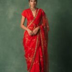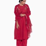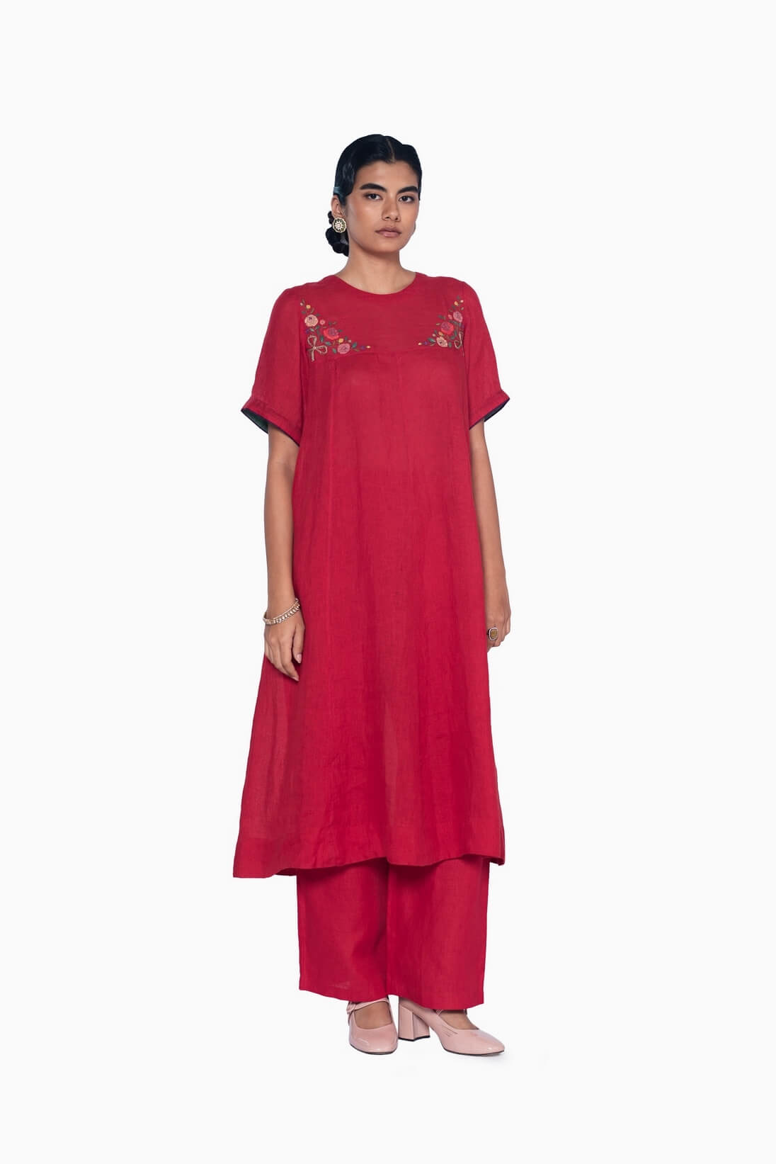 The Edith Set is a festive and bright shade of red linen kurta with A-line paneled cut. A standout embroidery motif adorns the yoke, crafted with intricate fabric appliqué and fine aari embroidery.