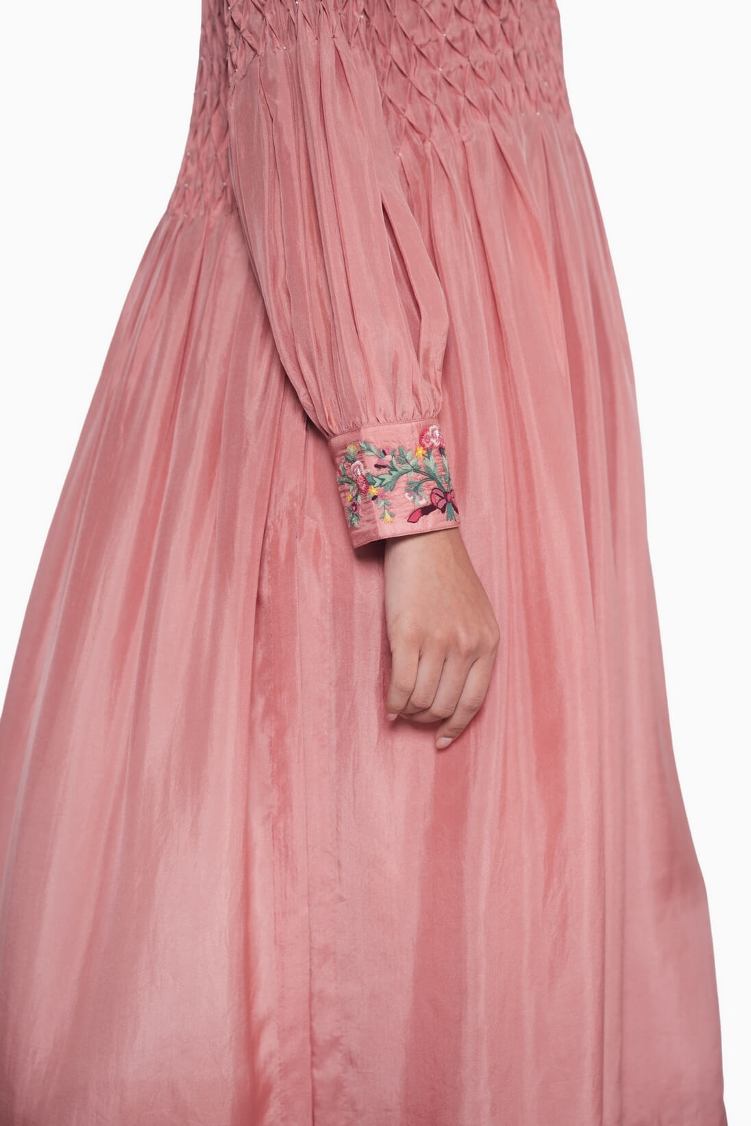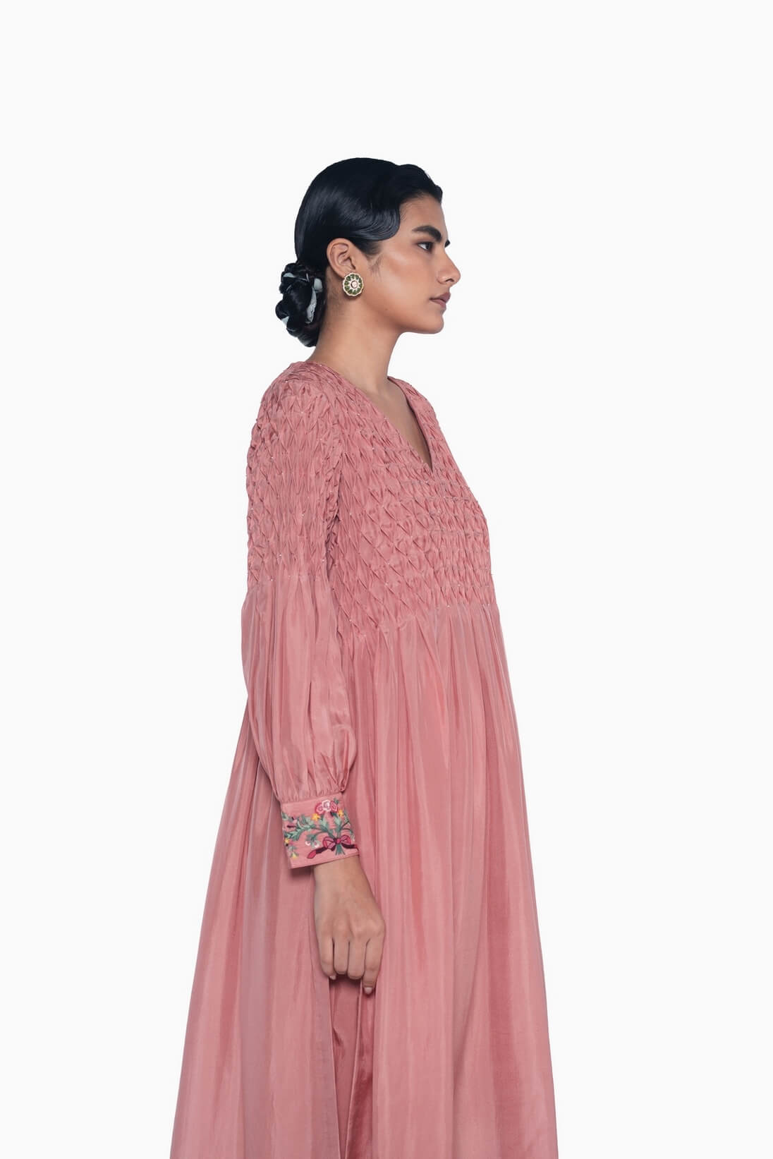 The Ellias is a fit-and-flare patterned kurta, featuring a hand-smocked and beaded bodice with intricately embroidered floral boquet on cuffs, crafted in soft, flowy fabric for a graceful silhouette, and paired with a modern, sleek pant in a matching color to complete the look.
