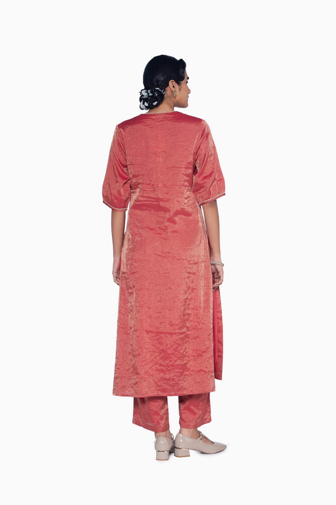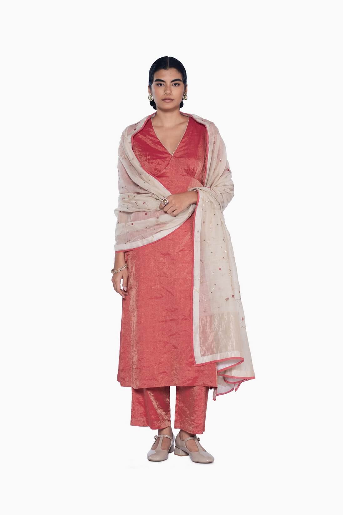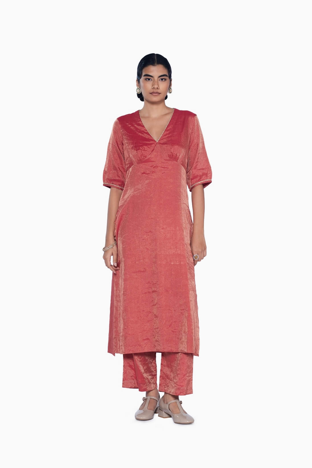 The Esmet Kurta features a fitted bodice with a metallic-lace-adorned V-neck, soft gathers under the bust, and an A-line cut with puffed sleeves, crafted in handwoven zari textile. It is paired with tapered pants in the same luxurious fabric.