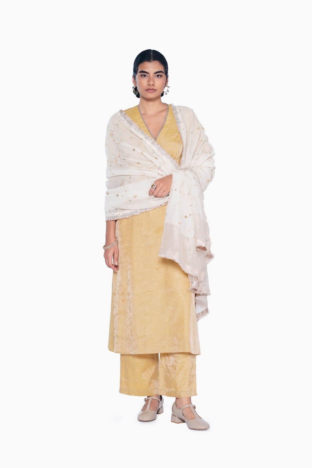 The Esmet Kurta features a fitted bodice with a metallic-lace-adorned V-neck, soft gathers under the bust, and an A-line cut with puffed sleeves, crafted in handwoven zari textile. It is paired with tapered pants in the same luxurious fabric.