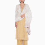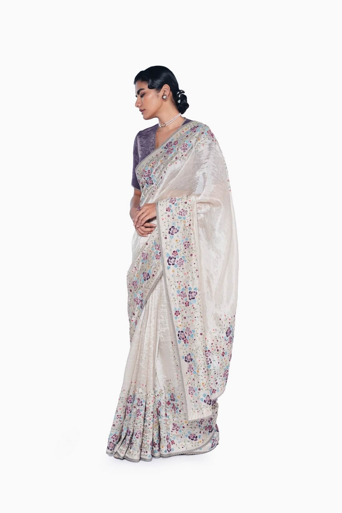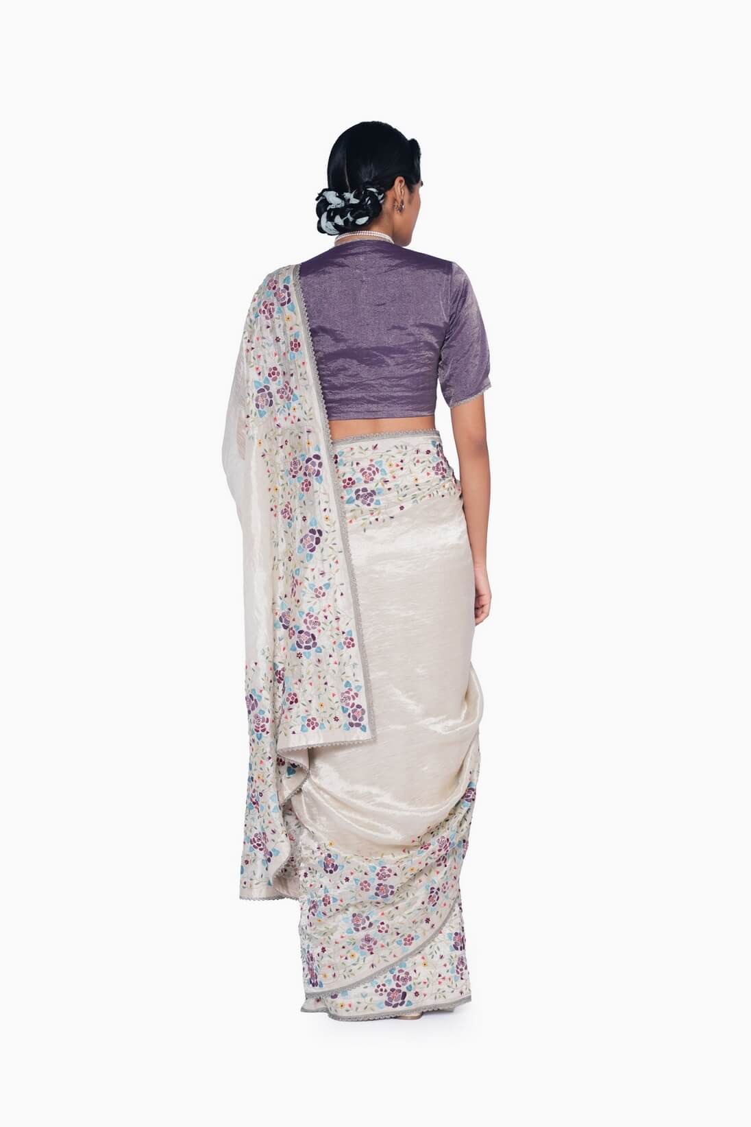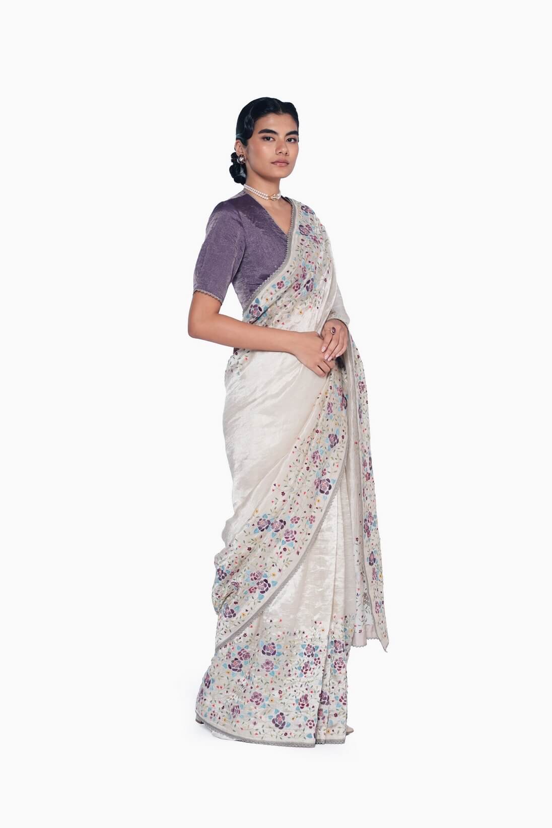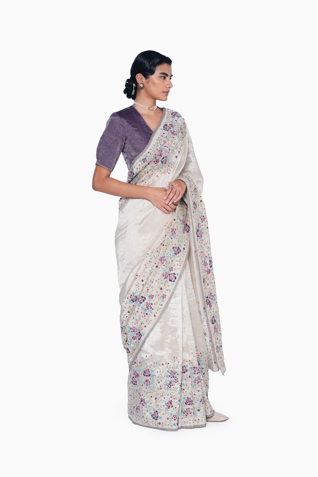 Esra showcases a blooming rose bush, with wild roses hand-appliquéd in cotton, silk, and zari, then embroidered over 2000 hours. Finished with French lace and a contrasting pining, this handwoven silver zari sari feels like a modern heirloom.