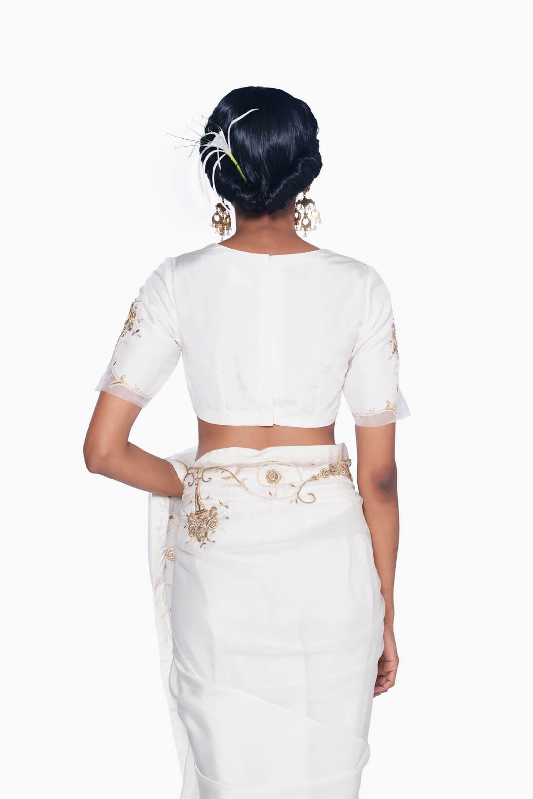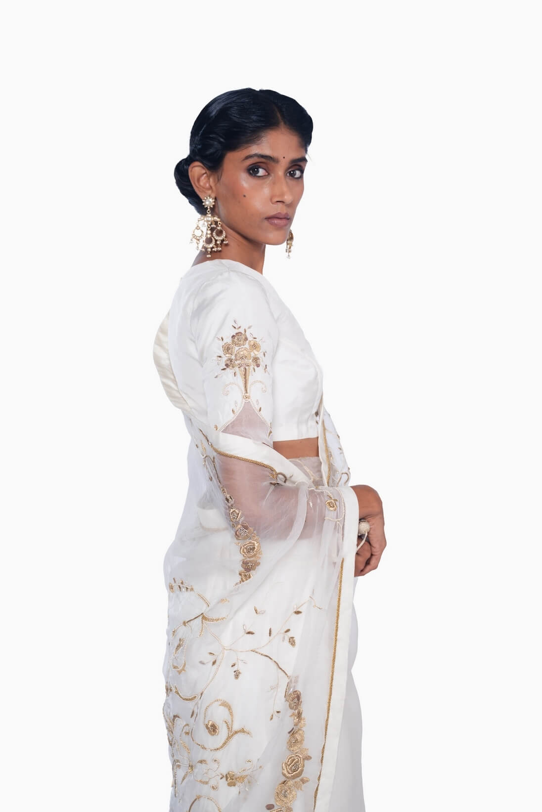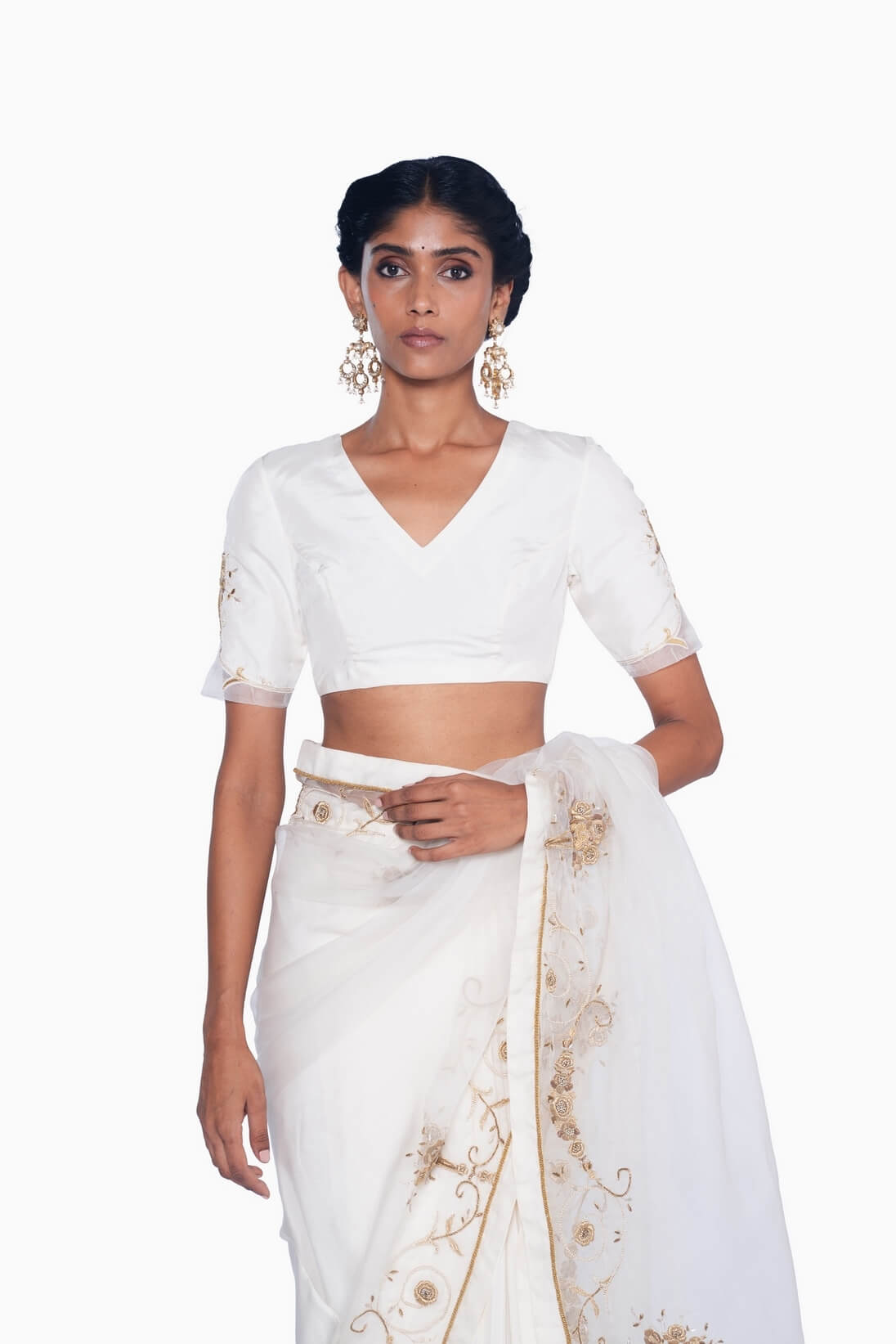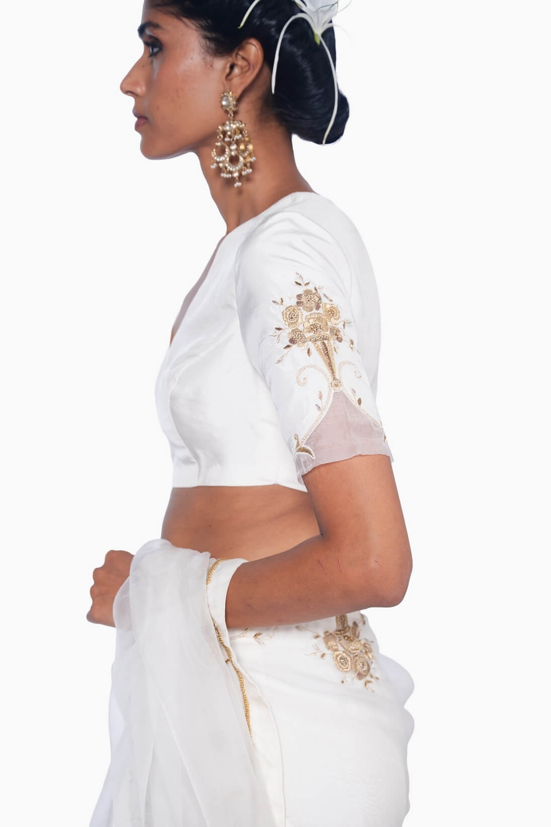 The Guldasta blouse, crafted in ivory mulberry silk, features a sharp V-neckline and elbow-length sleeves on a fitted bodice. The sleeves are adorned with gliding gold bouquet embroidery and finished with scalloped organza hems for a delicate, refined touch.