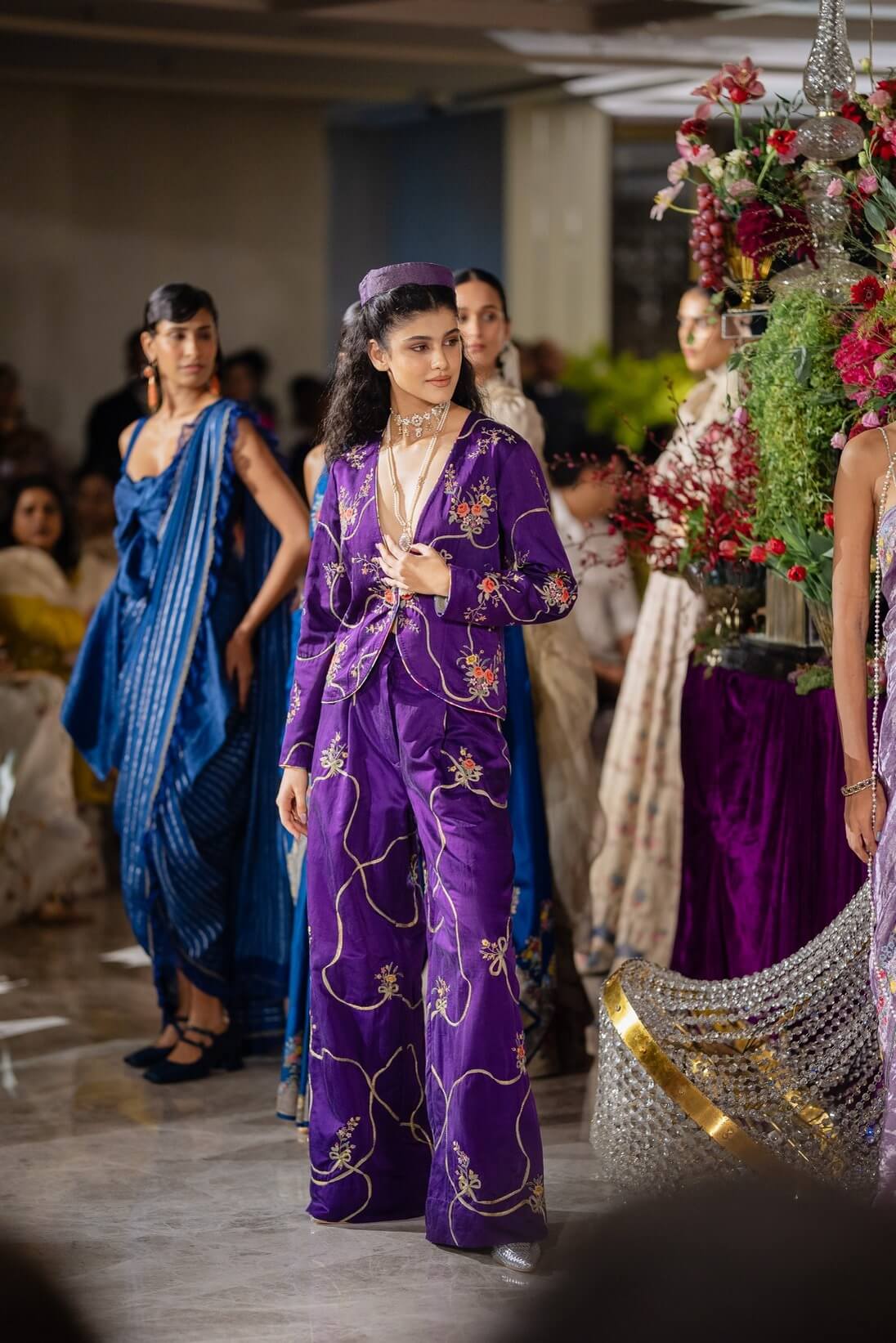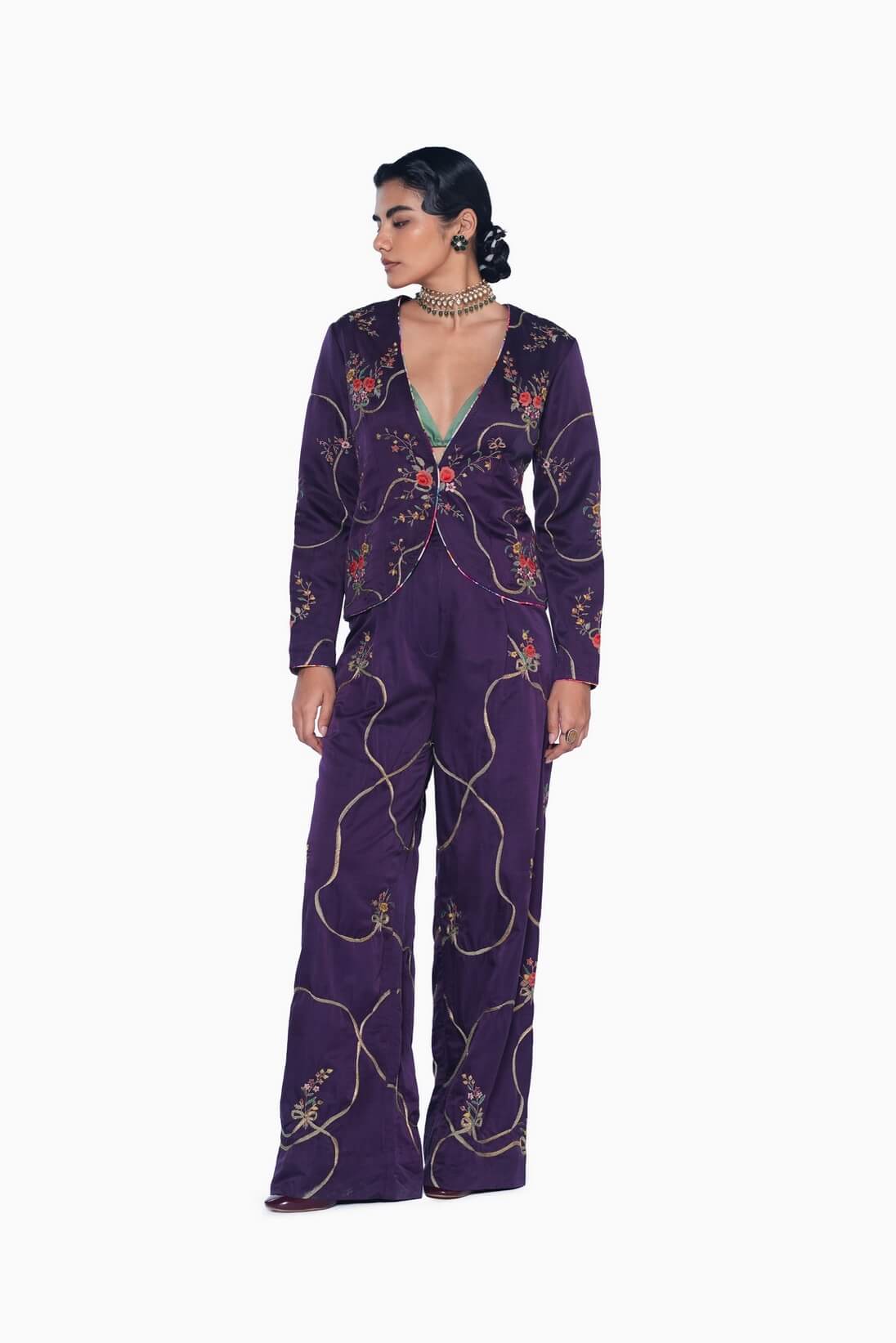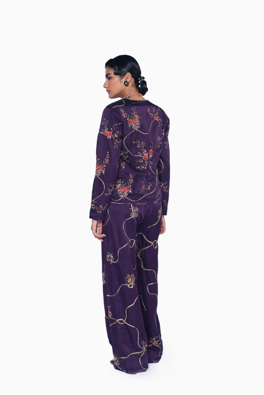 The Nilofer pant, crafted in handwoven satin fabric, showcases the signature French floral bouquets tied with finely embroidered ribbons in an all-over pattern, meticulously appliqued and hand-embroidered in bright, cheerful colors on a rich purple base, while a hand-painted design on the lining adds a playful, artistic touch.