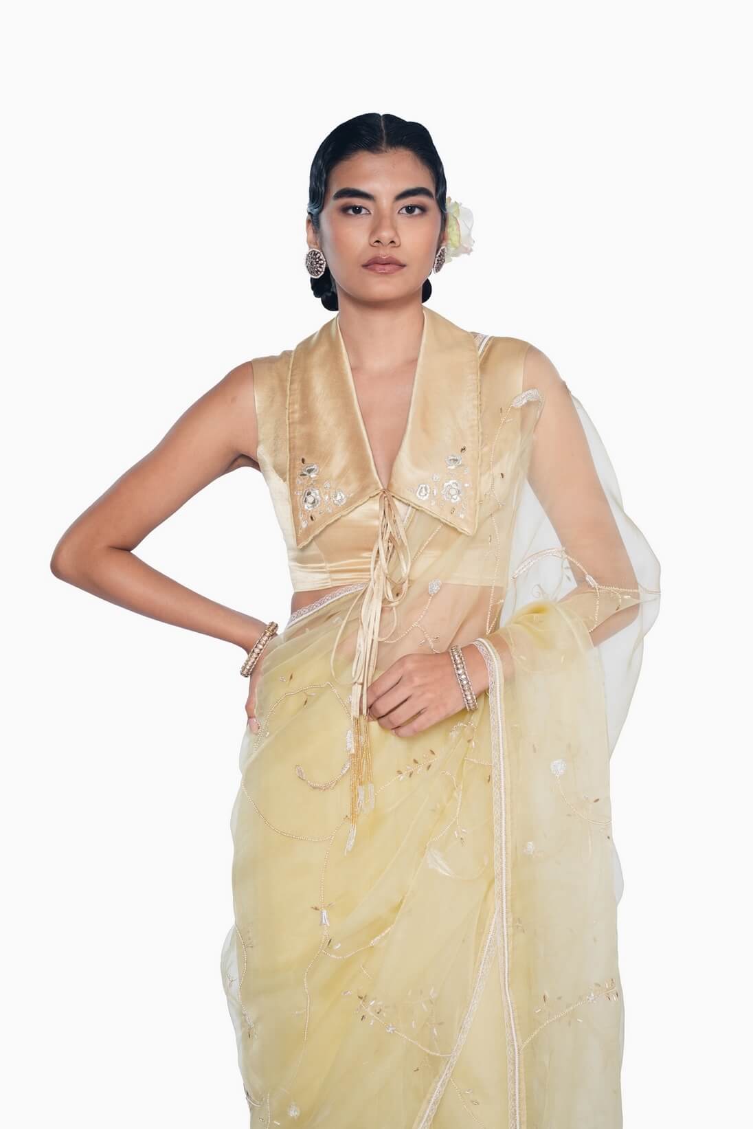 The Nisa blouse features a fitted handwoven satin bodice in pale yellow, with a broad collar adorned with floral embroidery, finished with lace edging and beaded tie-ups reminiscent of vintage flapper-style dresses.