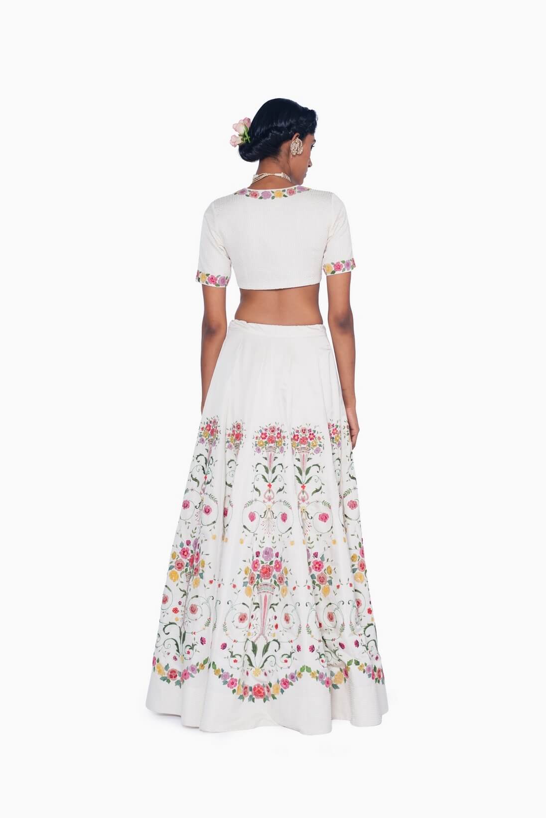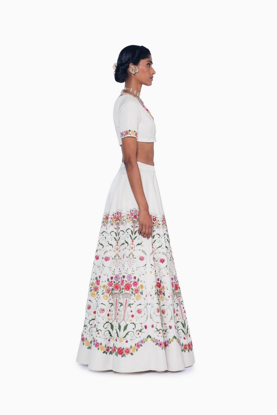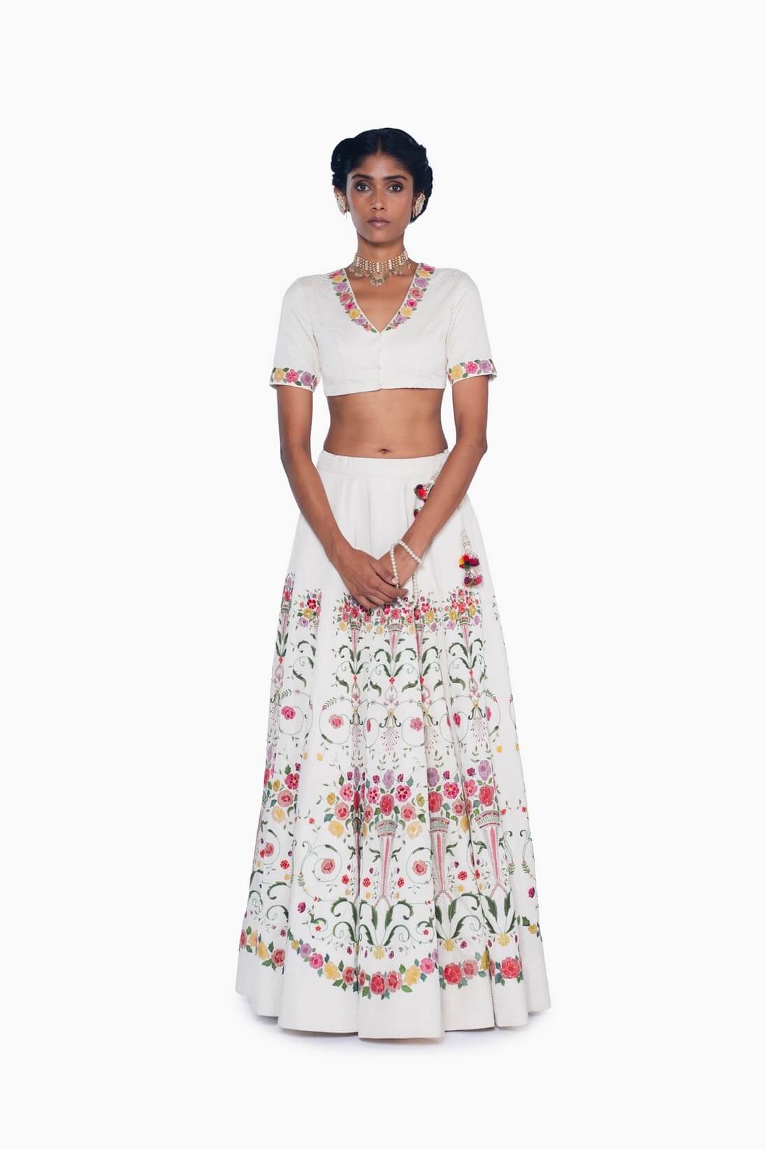 The Sarmast Ivory Lehenga embodies the spirit of intoxicated joy that defines Sarmast. Romantic yet exuberant, baroque-inspired arches canvas of ivory, adorned with colorful hand-appliqué bouquets, intricate beadwork, and delicate hand emebroidery.