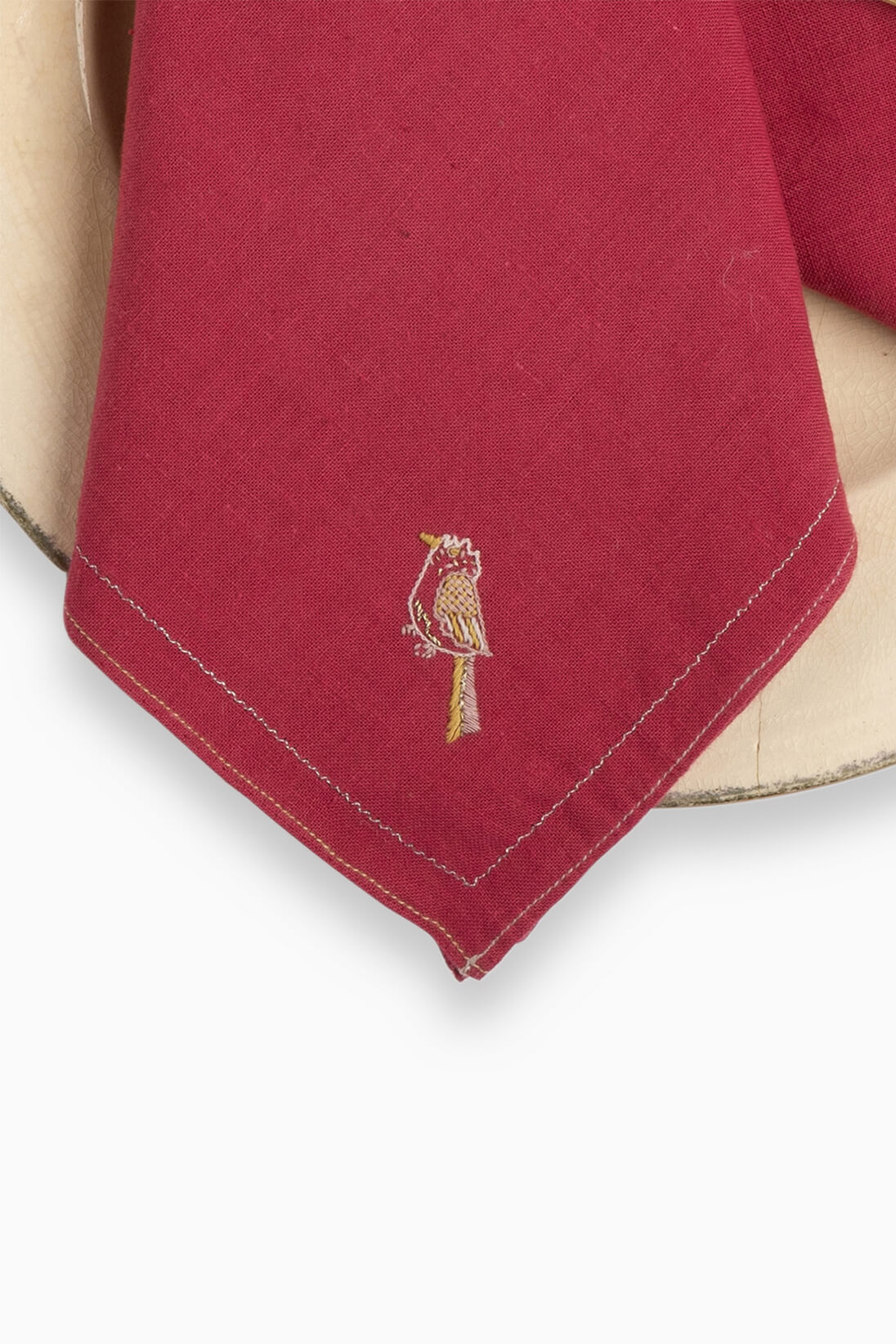 Handspun and handwoven cotton napkins, crafted with care. Featuring a solid vibrant color, the set includes one napkin with a delicate hand-embroidered bird motif and a contrasting hemline for a charming, standout detail —perfect for brightening everyday meals or special gatherings.