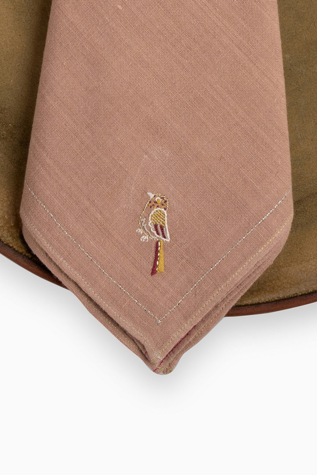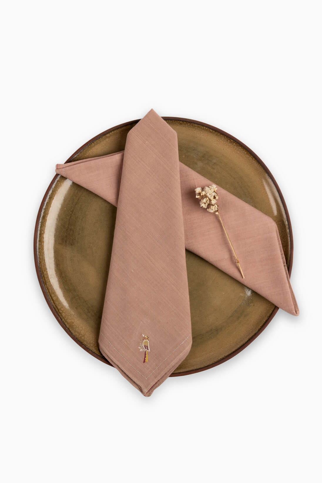Handspun and handwoven cotton napkins, crafted with care. Featuring a solid soft color, the set includes one napkin with a delicate hand-embroidered bird motif and a contrasting hemline for a charming, standout detail —perfect for brightening everyday meals or special gatherings.