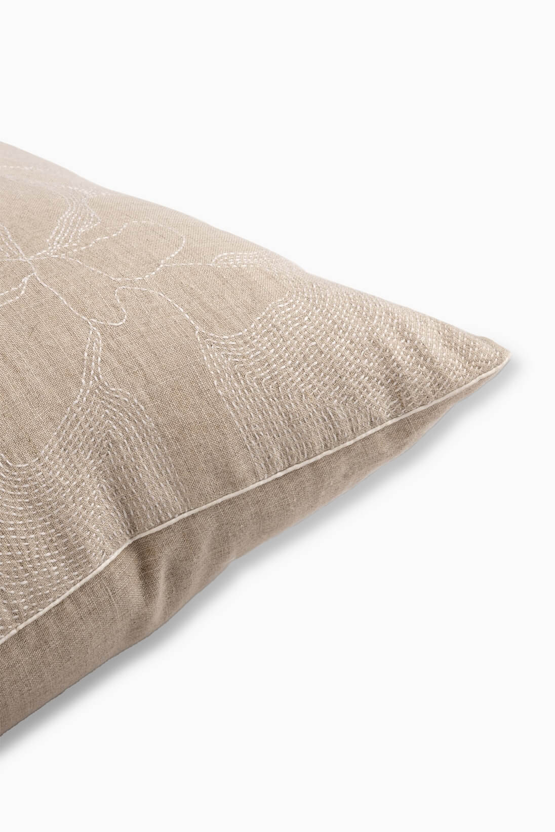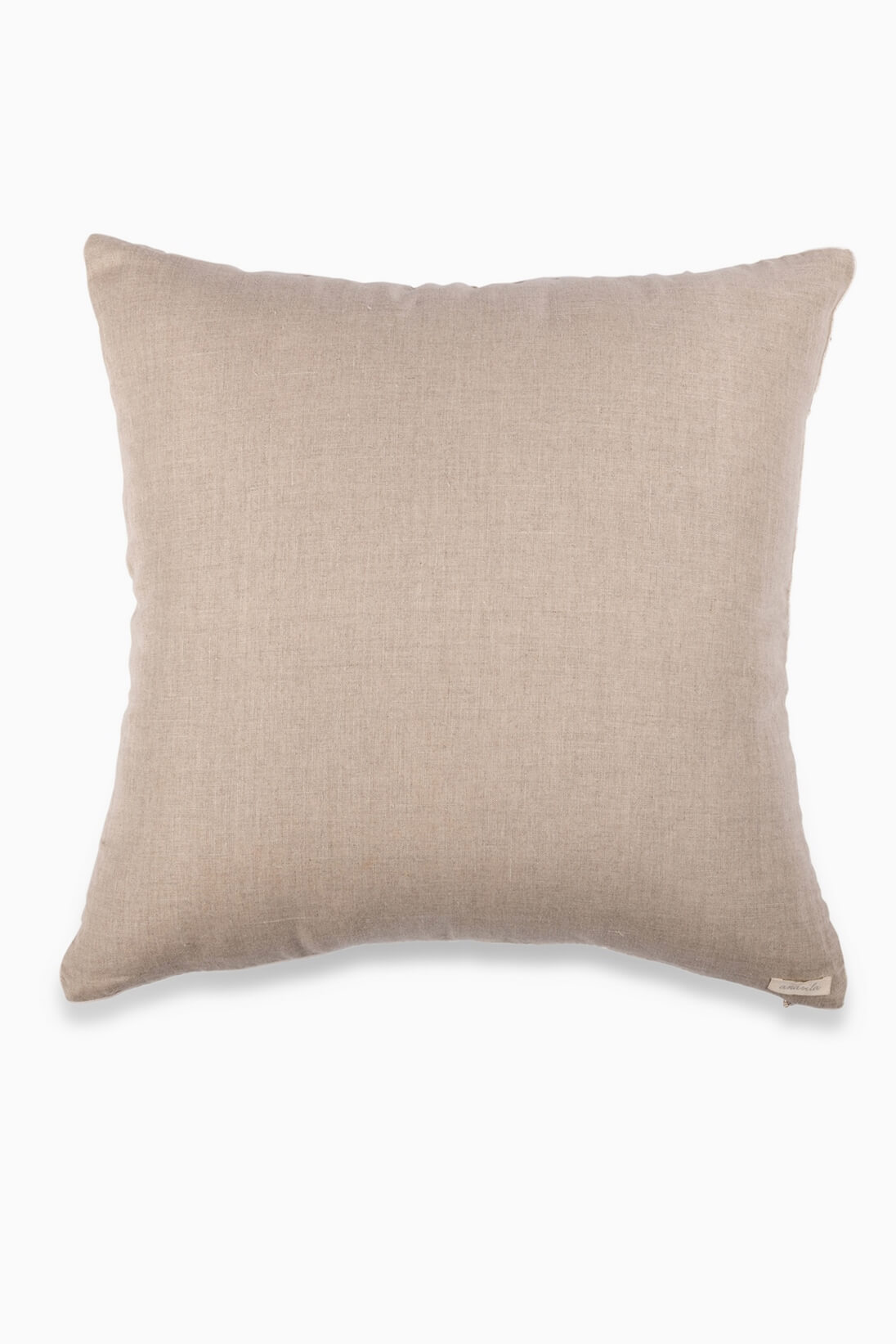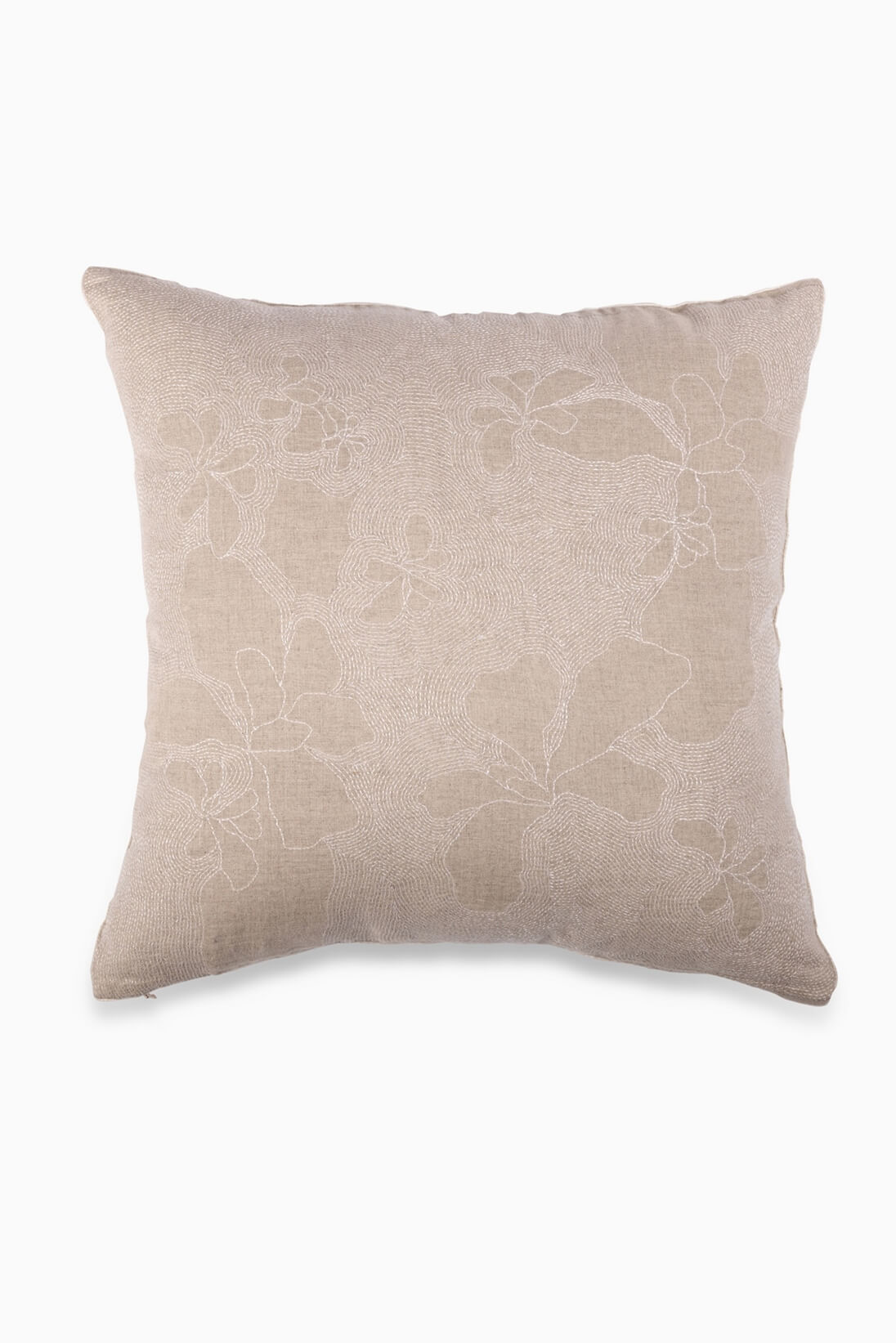 Abstract Floral Sujini Cushion Cover features hand-embroidered Sujini in an abstract floral pattern with raw ivory threads on a warm natural beige base. A classic design that showcases fine craftsmanship, it adds a touch of elegance and refinement to any setting.