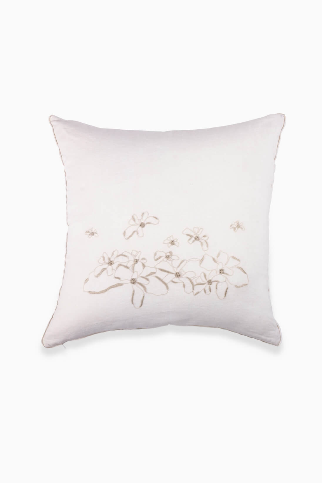 The Ivory Floral Sujini Cushion Cover features an abstract floral pattern hand-embroidered with warm natural beige threads on a classic raw ivory linen base. Showcasing traditional Sujini craftsmanship, this cushion blends subtle texture with refined detailing, adding timeless elegance and character to any space.