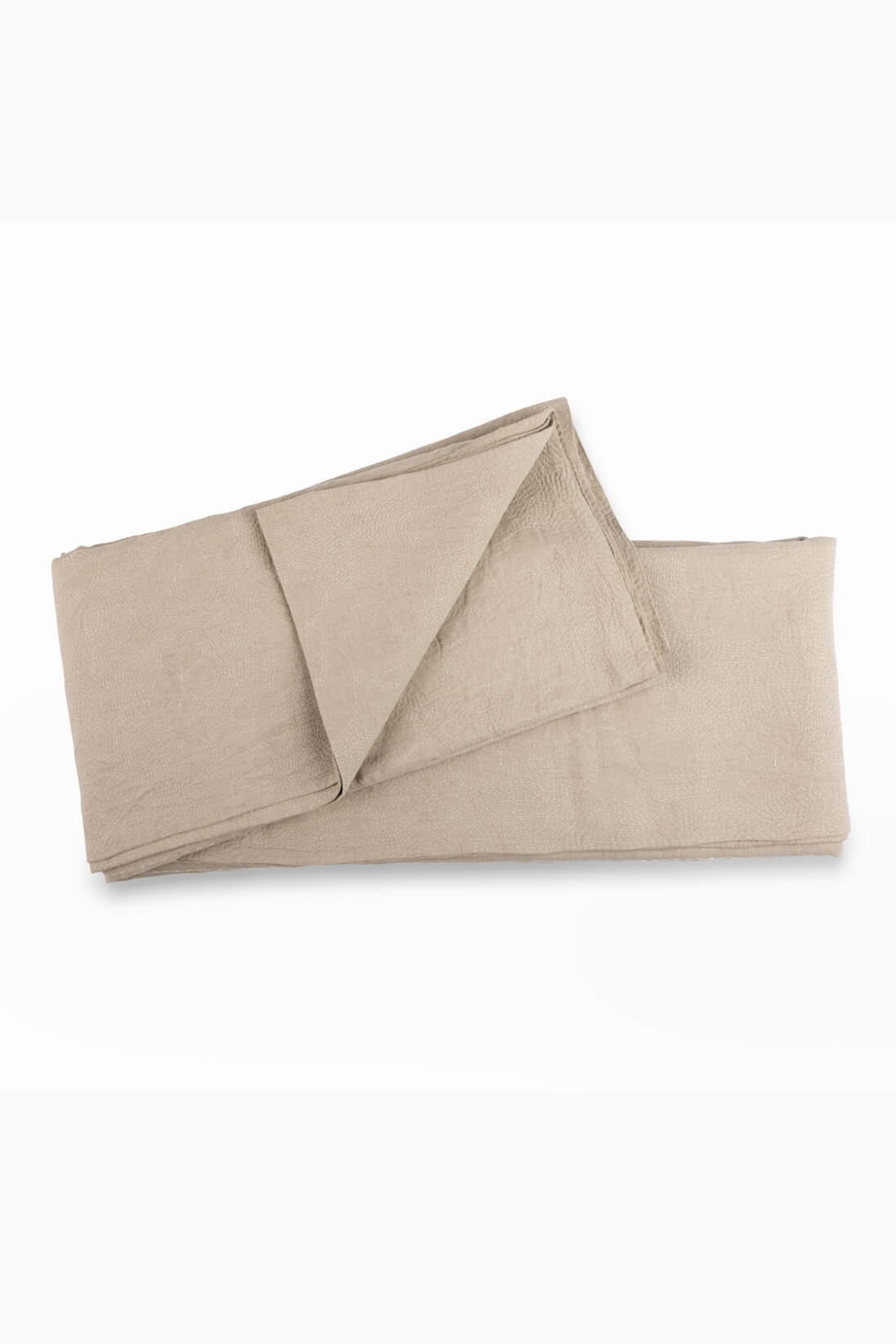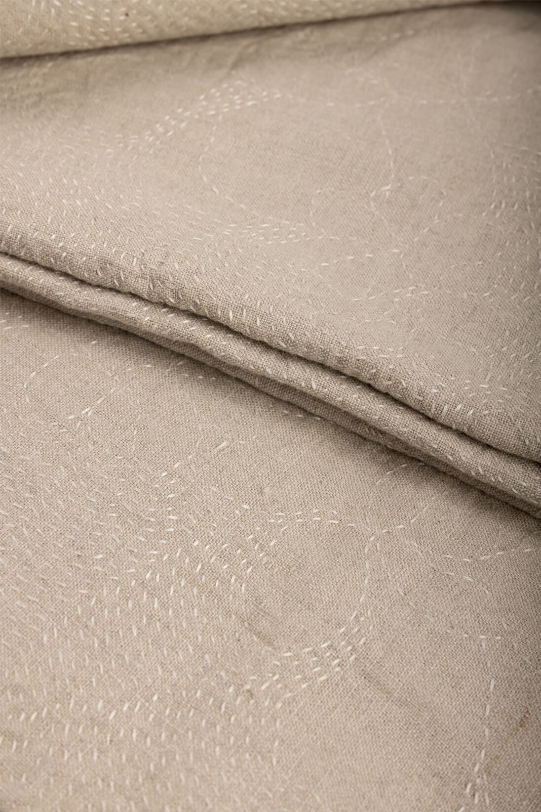 Natural Sujini Bed Cover features hand-embroidered Sujini in an abstract floral pattern with ivory threads on a natural linen base. A classic design that highlights skilled craftsmanship, it offers a clean, elegant look suitable for upscale and comfortable bedroom spaces.