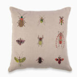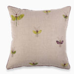 The Darner Dragonfly Cushion Cover features eclectic hand-appliqué and delicately embroidered dragonflies, commonly found in a country garden, all set in a warm green color scheme against a natural linen base.