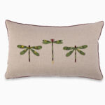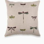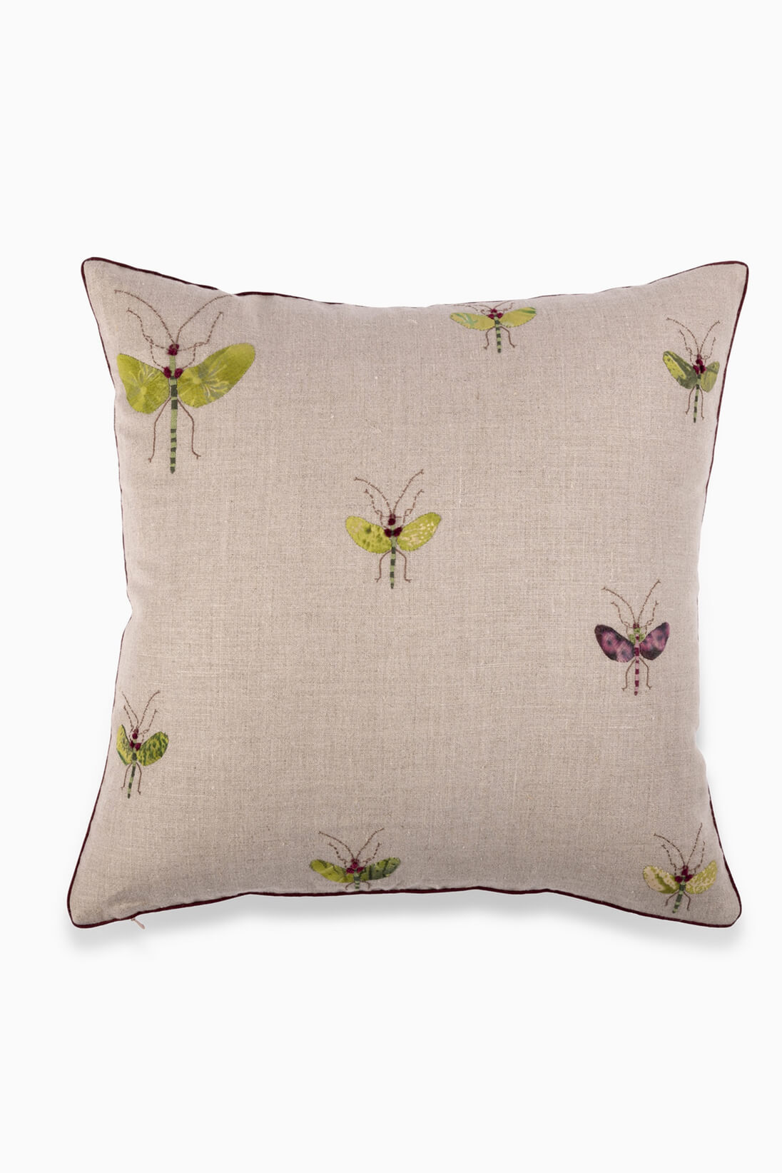 The Flower Moth Cushion Cover features eclectic hand-appliqué and delicately embroidered bugs, commonly found in a country garden, all set in a warm green color scheme against a natural linen base.
