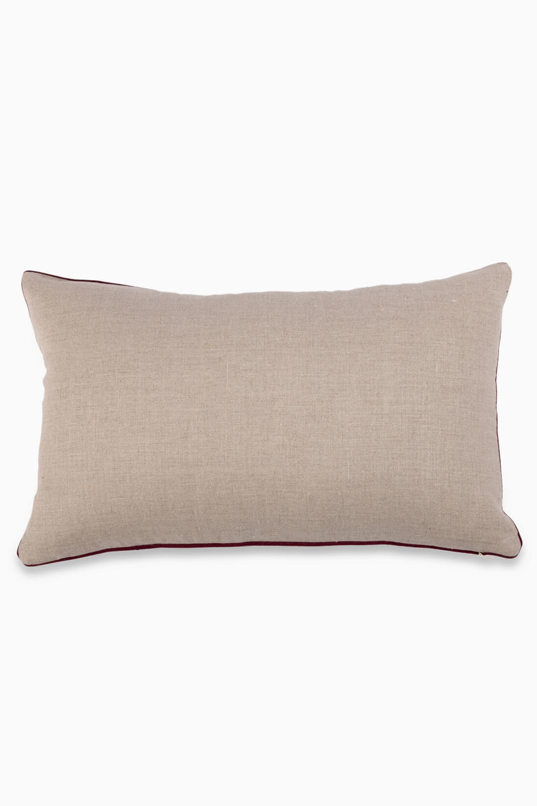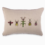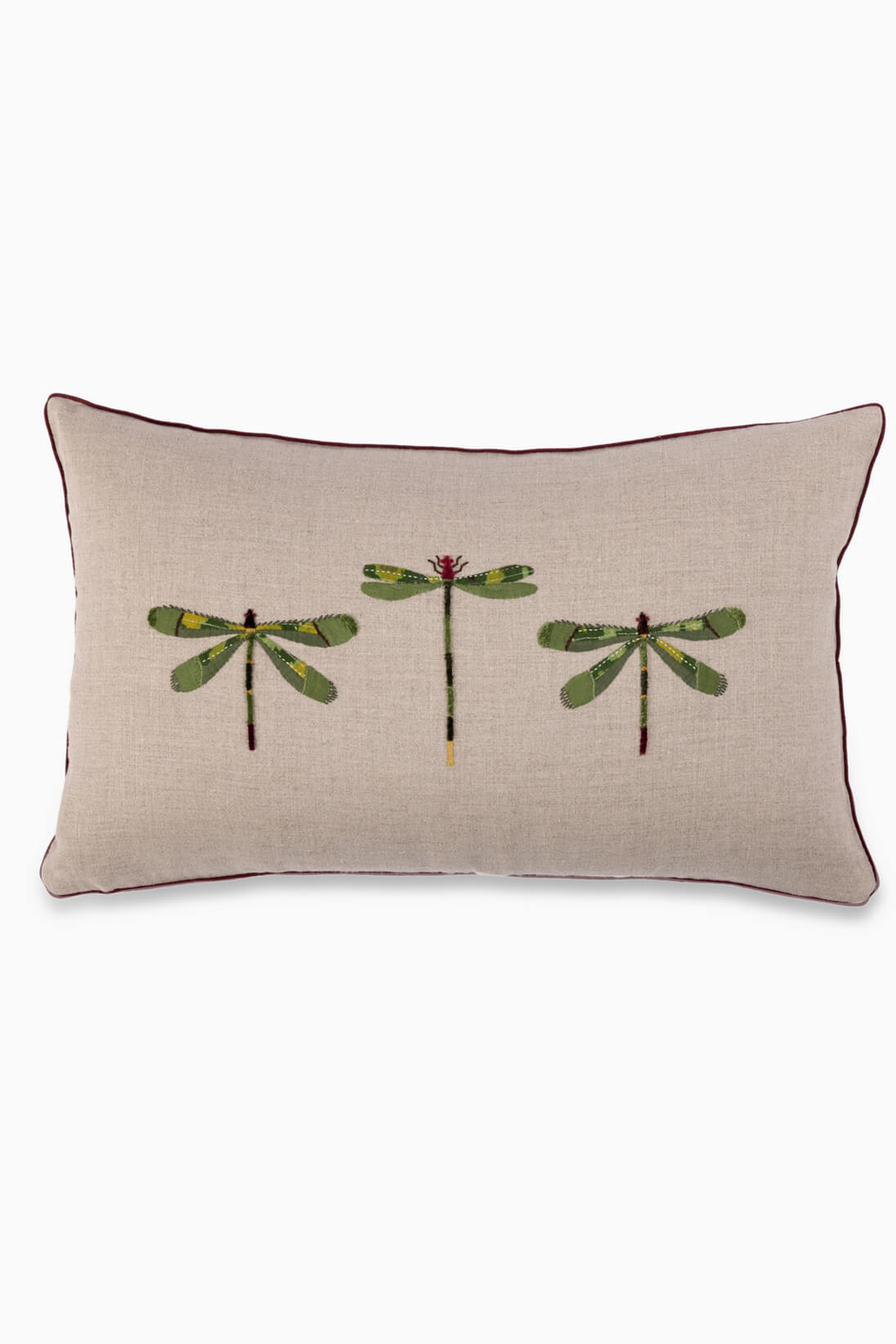 The Green Dragonfly Cushion Cover features eclectic hand-appliqué and delicately embroidered bugs, commonly found in a country garden, all set in a warm green color scheme against a natural linen base.