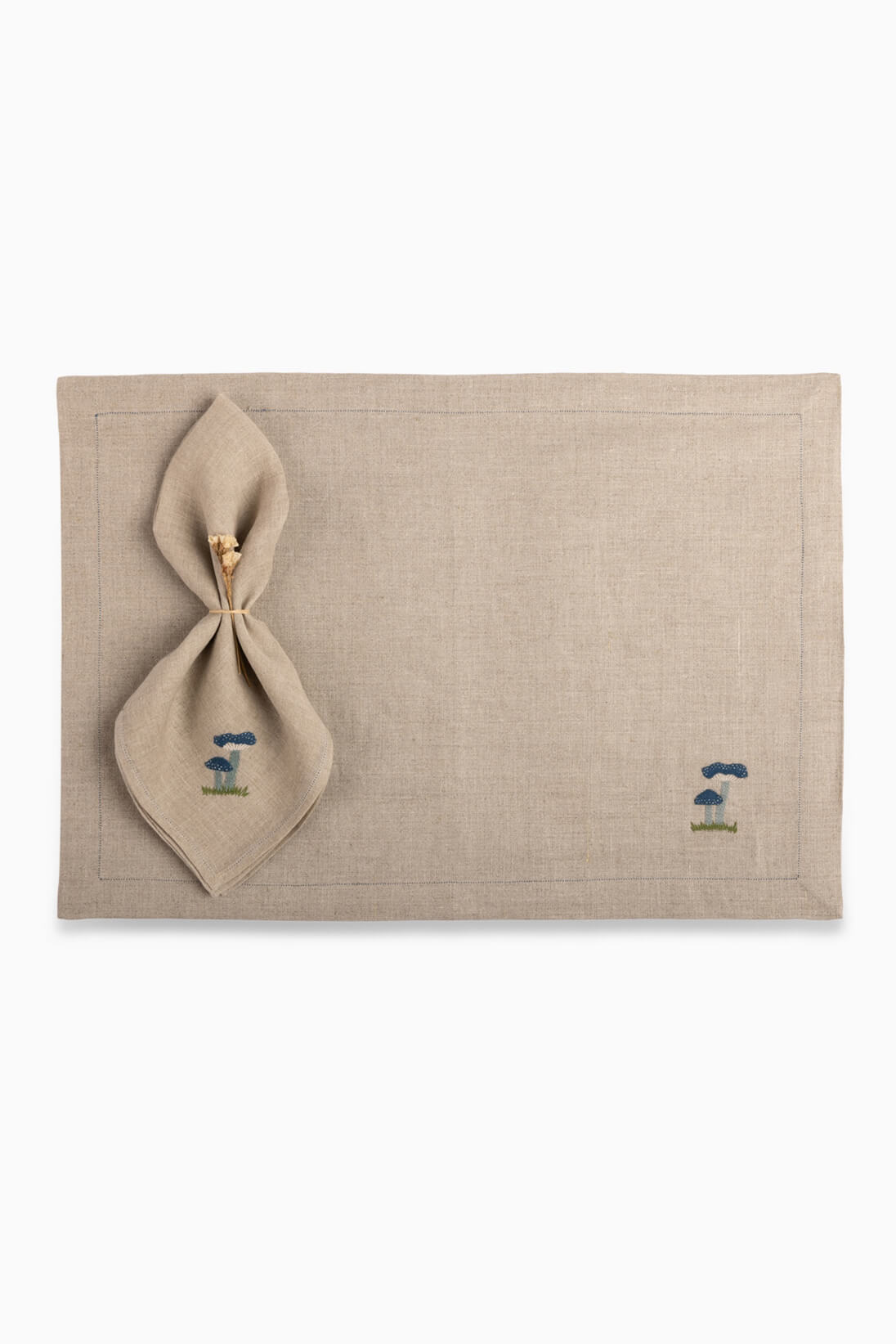 This Natural Linen Placemat features hand-embroidered mushroom motifs in the corner, reminiscent of garden mushrooms, adding a charming touch of nature to your table setting with a rustic, earthy appeal.