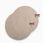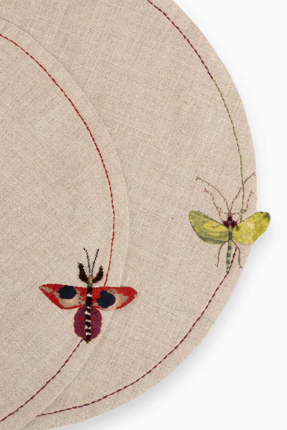 Crafted from natural linen, this circular placemat features hand-appliquéd and hand-embroidered bug motifs in the corner—reimagined garden insects seen through a vibrant, eclectic lens. It brings a charming, earthy touch of nature to your table setting.