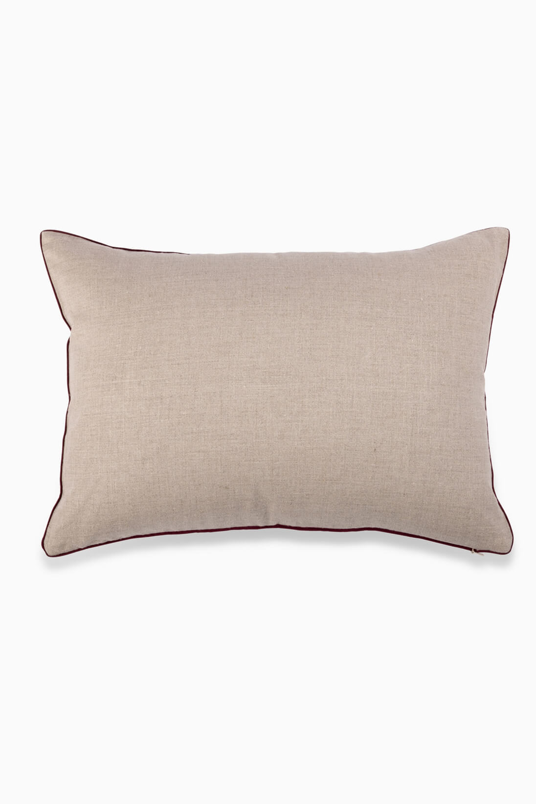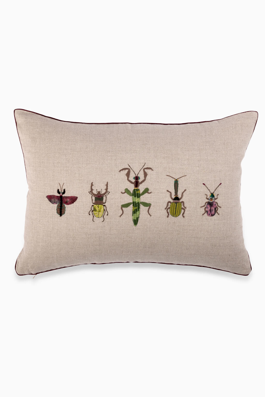 The Mantis & Friends Cushion Cover features eclectic hand-appliqué and delicately embroidered bugs, commonly found in a country garden, all set in a warm green color scheme against a natural linen base.