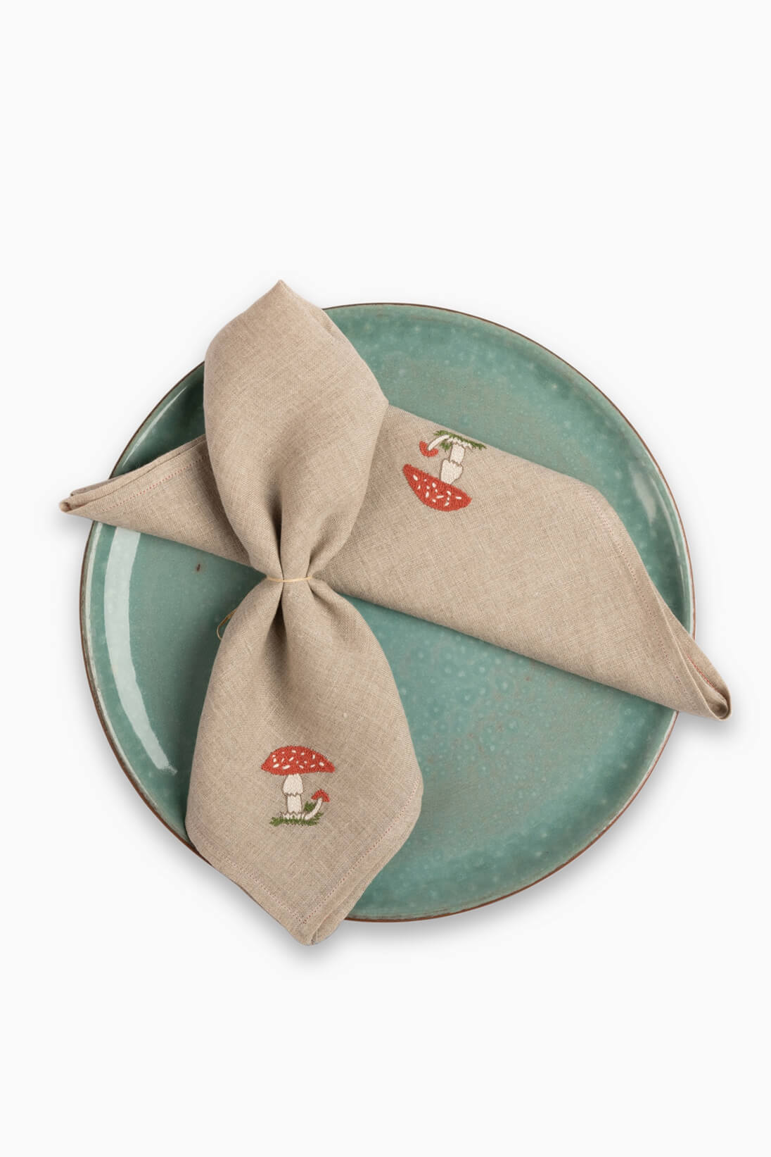 This Natural Linen Napkin features hand-embroidered mushroom motifs in the corner, reminiscent of garden mushrooms, adding a charming touch of nature to your table setting with a rustic, earthy appeal.