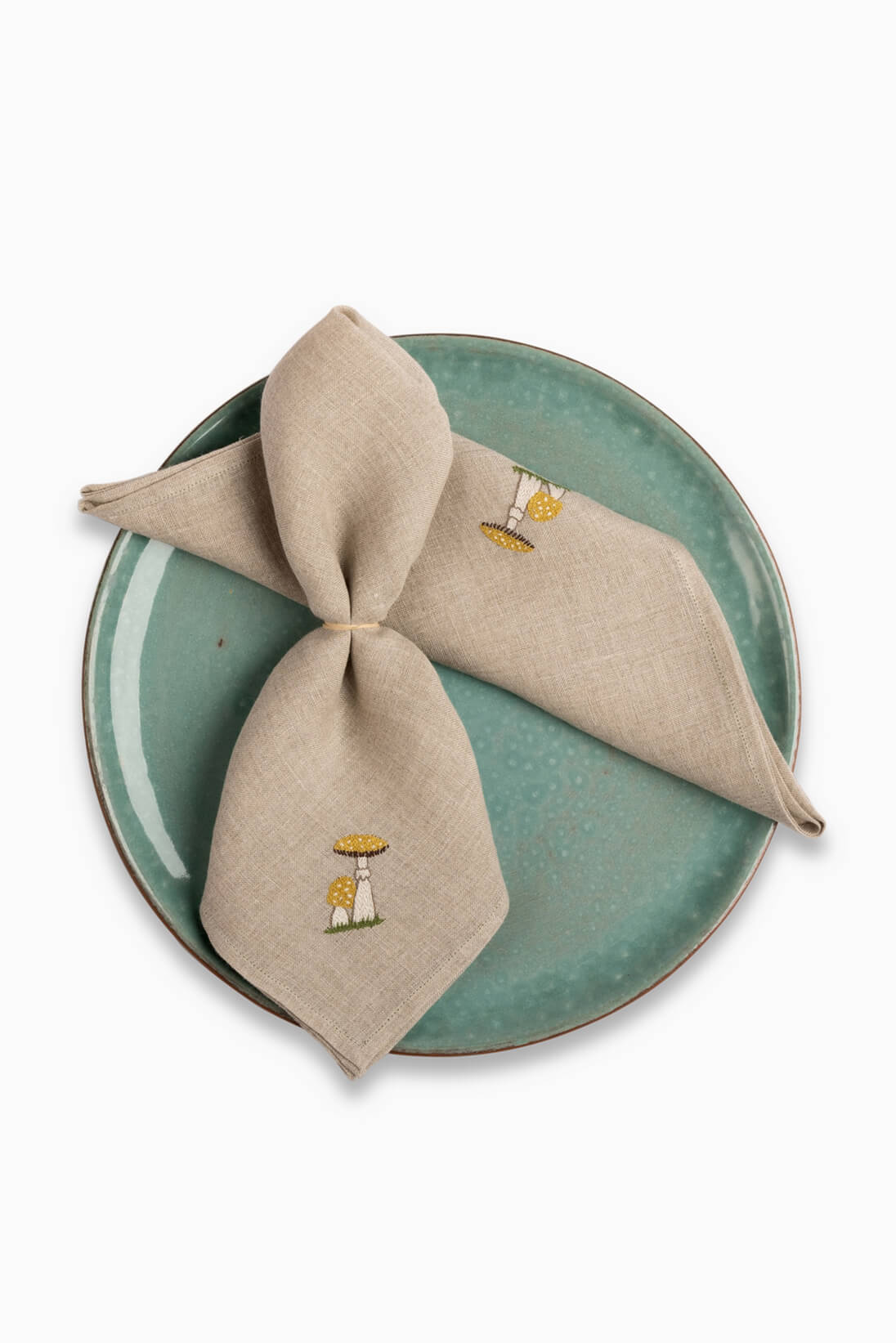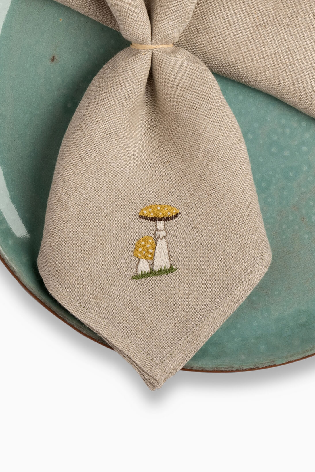 This Natural Linen Napkin features hand-embroidered mushroom motifs in the corner, reminiscent of garden mushrooms, adding a charming touch of nature to your table setting with a rustic, earthy appeal.