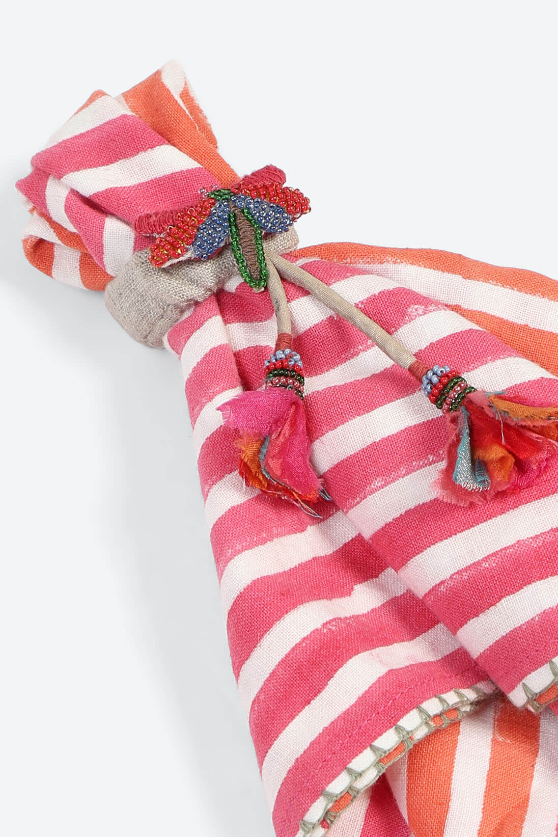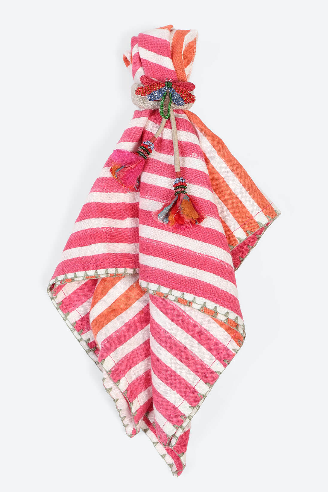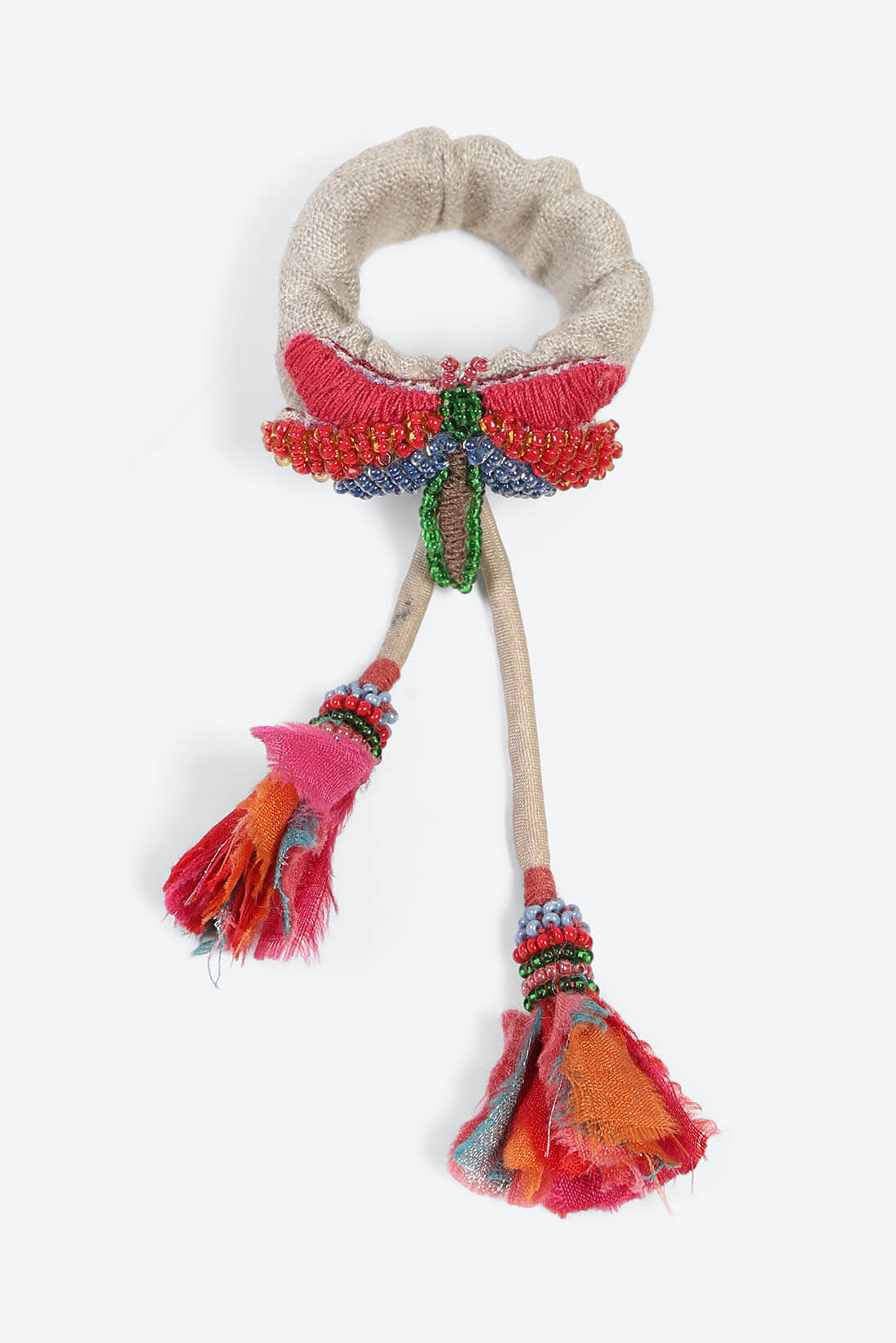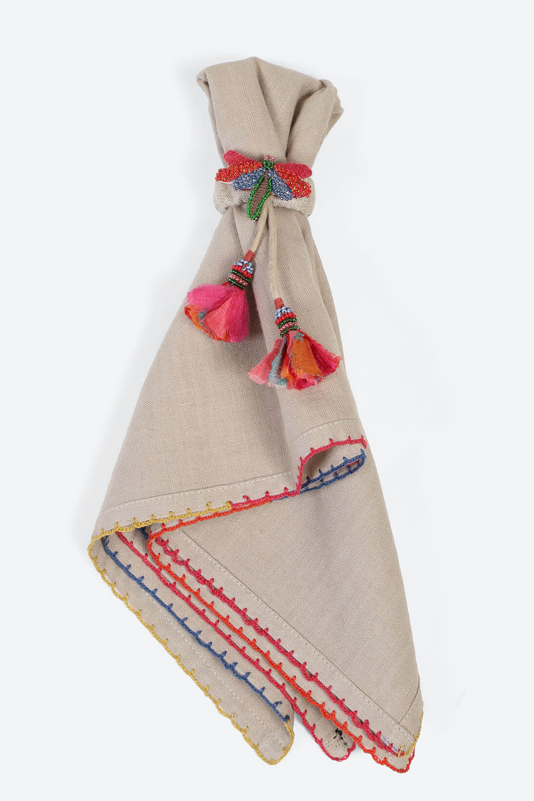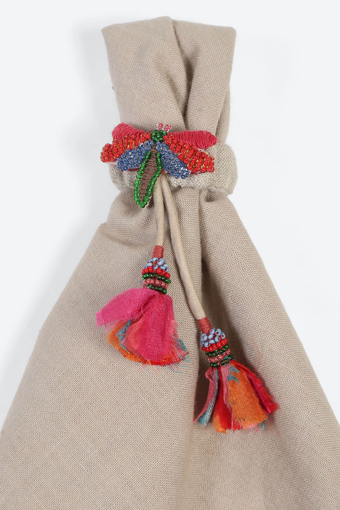 Alita Napkin Tie features a handcrafted beaded dragonfly and tassels on an elasticated napkin ring for table arrangements.