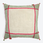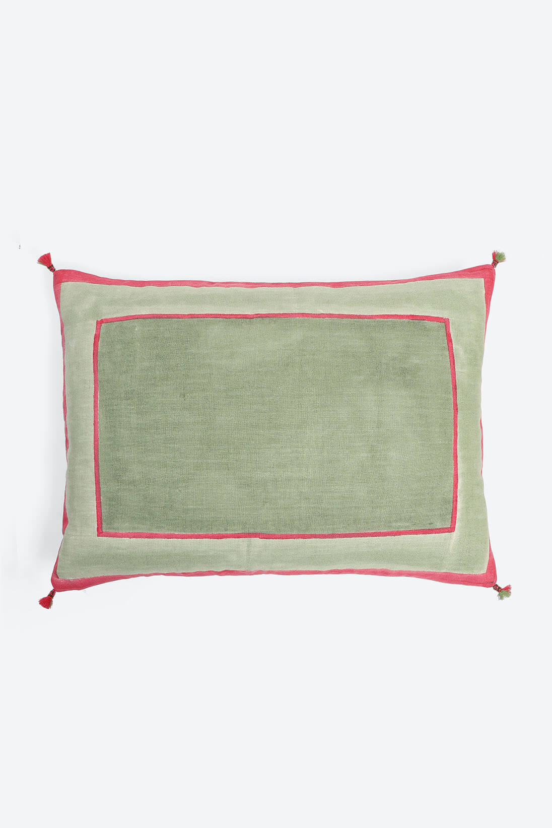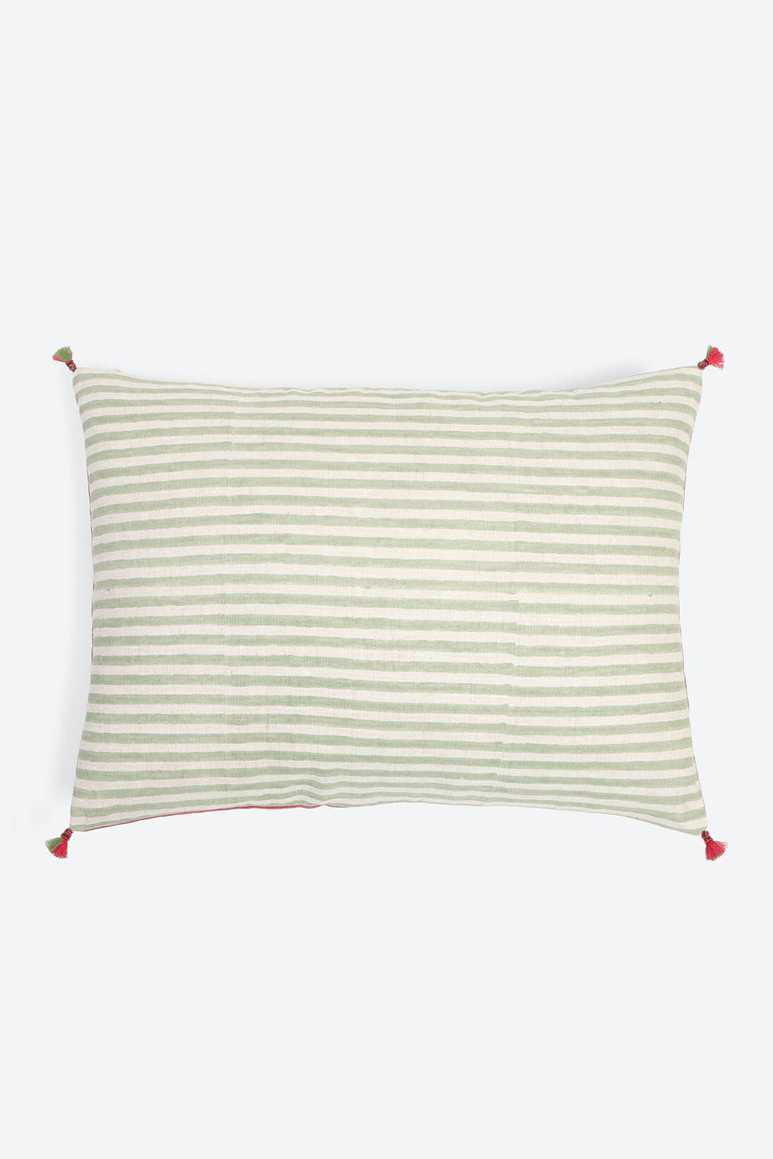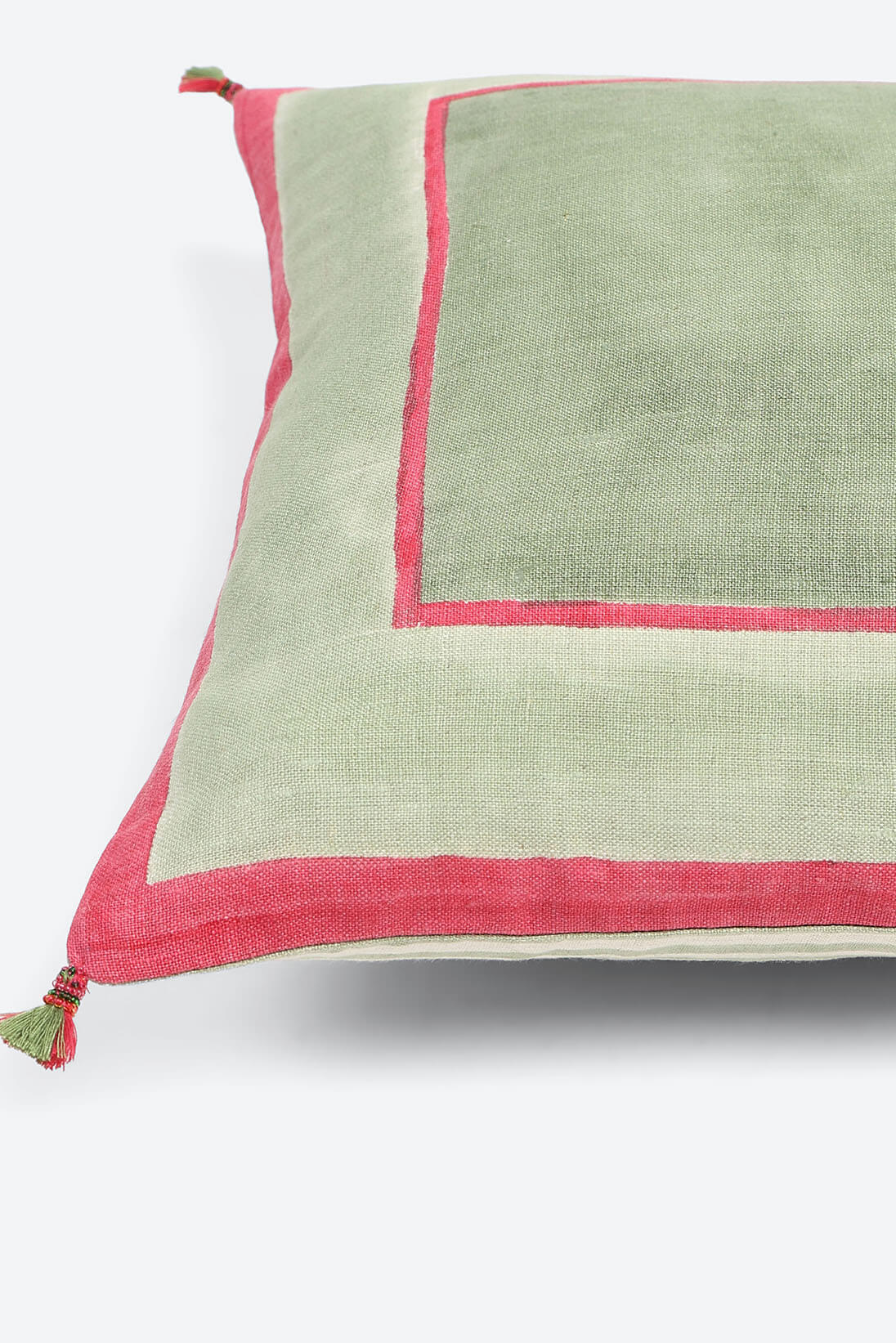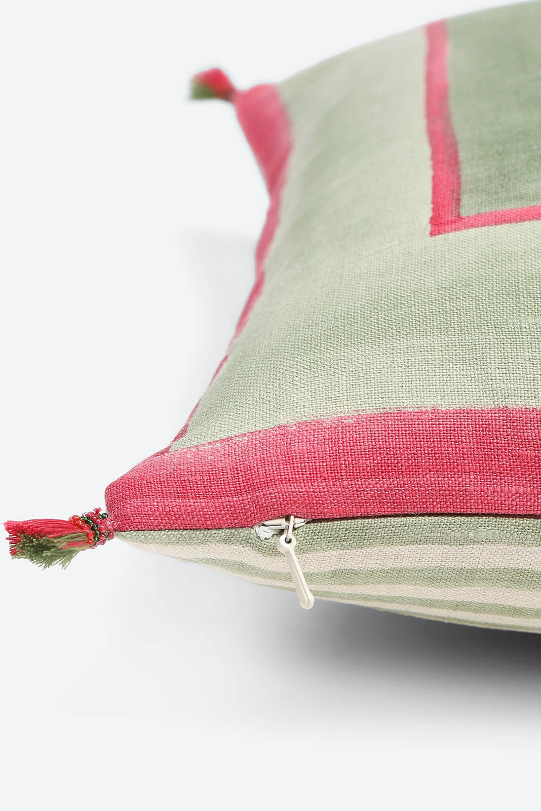 Brisa Verde Cushion Cover is crafted from a placement block printed textile and decorated with hand carfted beaded tassels.