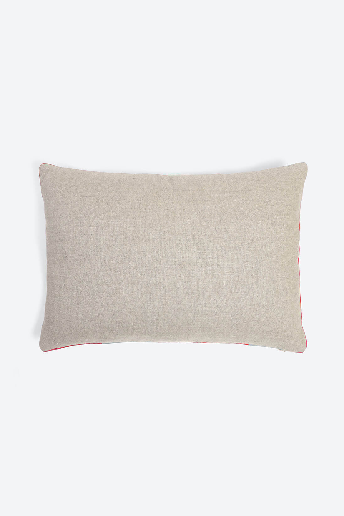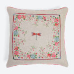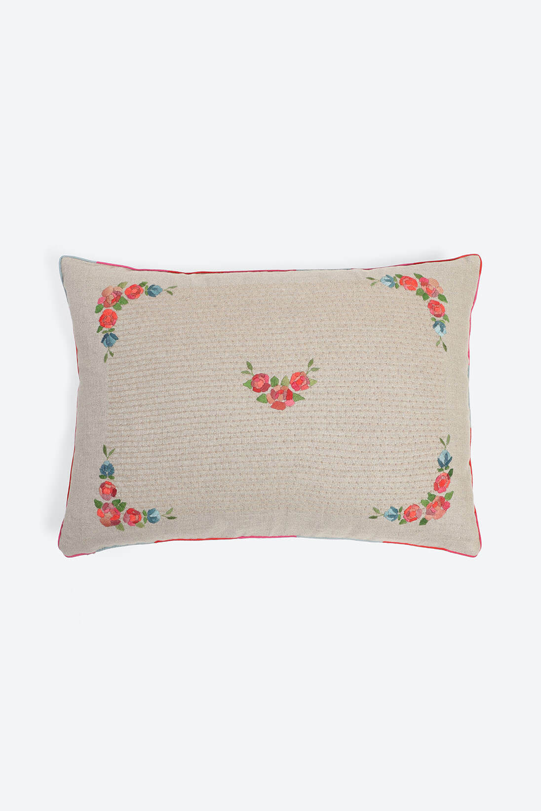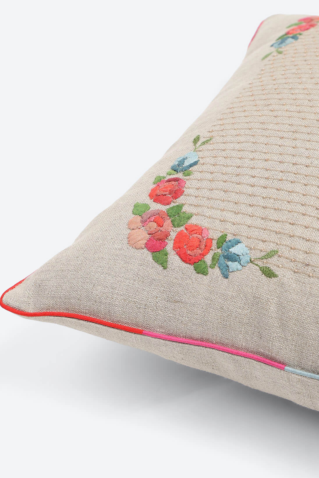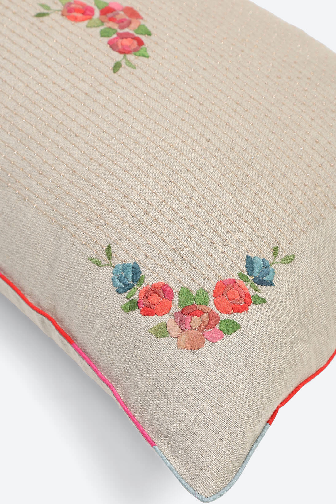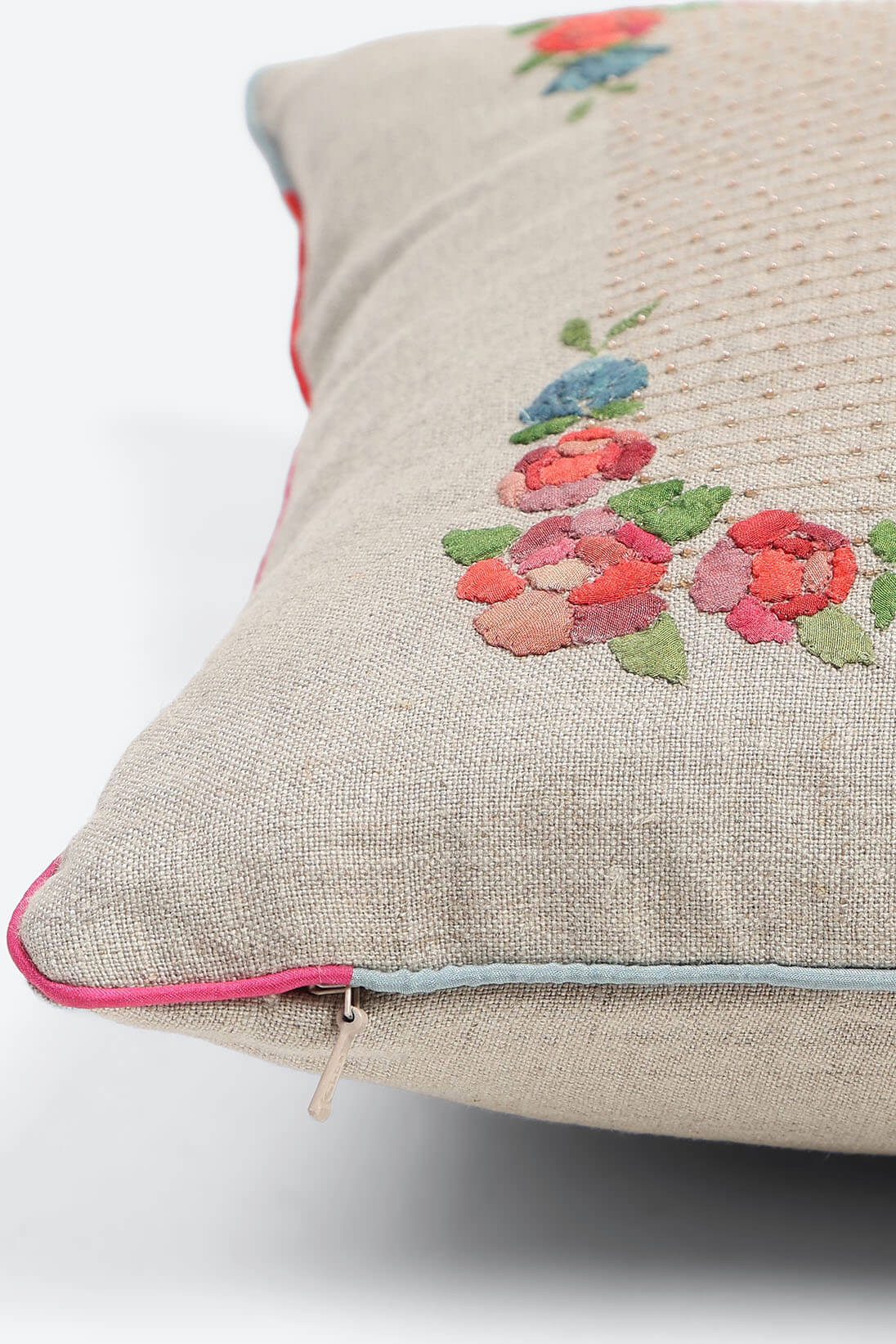 Nectarina Cushion Cover features a detailed hand crafted rose motif placed in the centre of a floral applique frame.