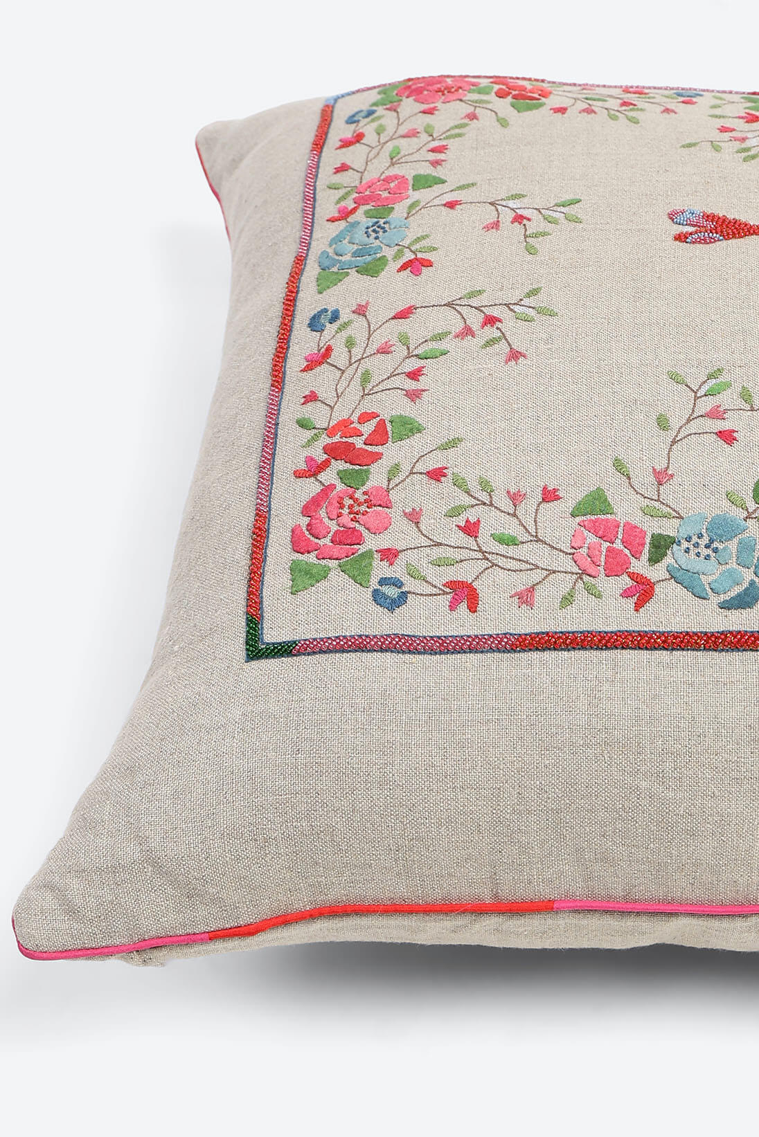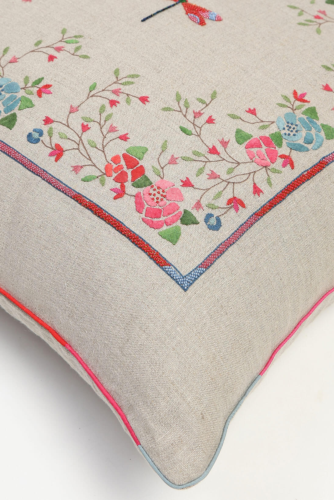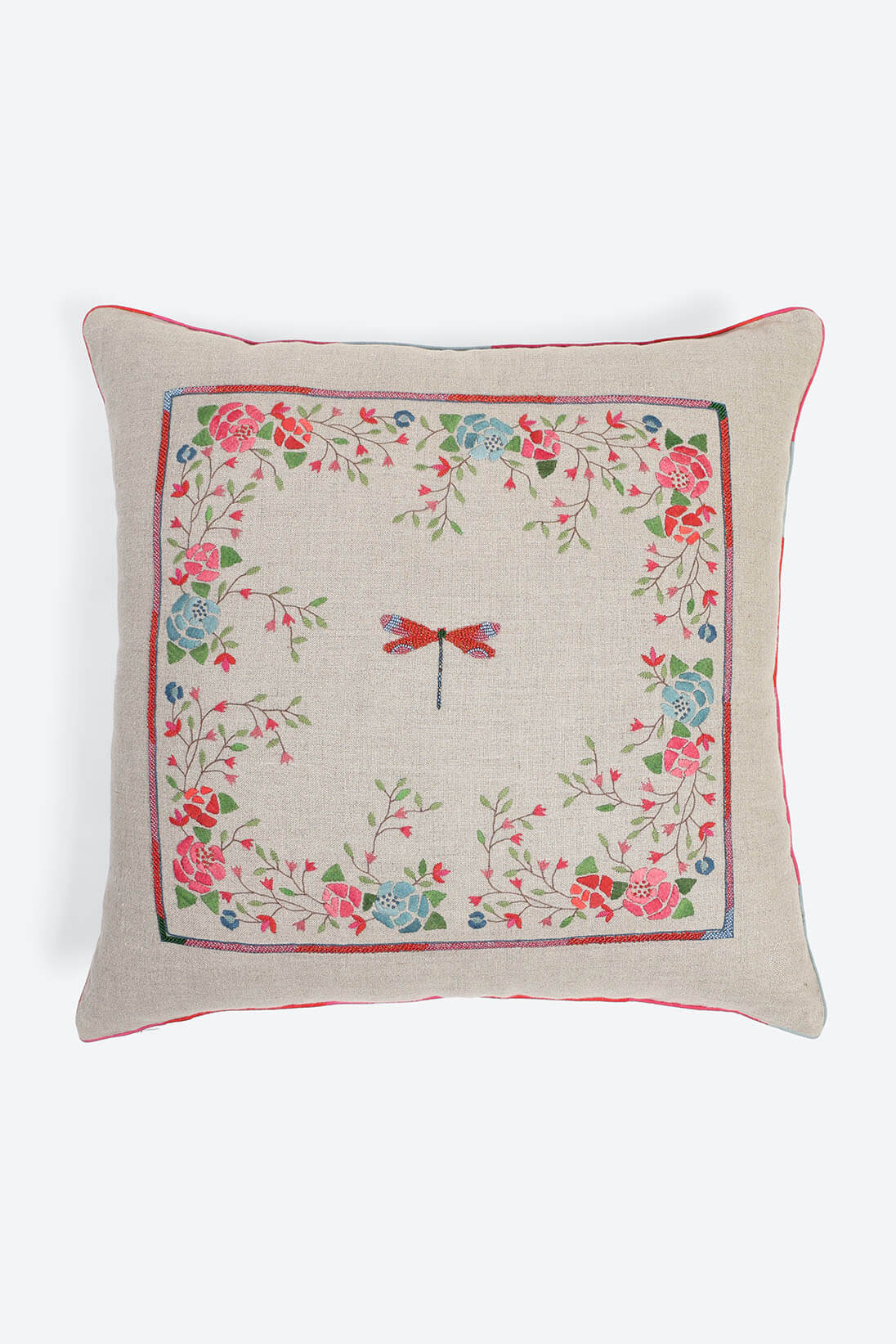 Rosa Viva Cushion Cover features a detailed hand crafted dragonfly motif placed in the centre of a floral applique frame on natural linen texture.